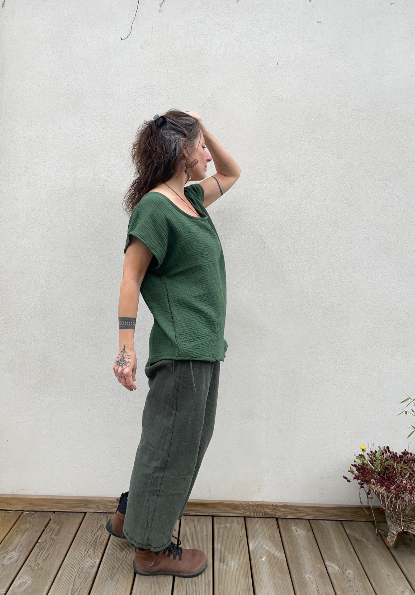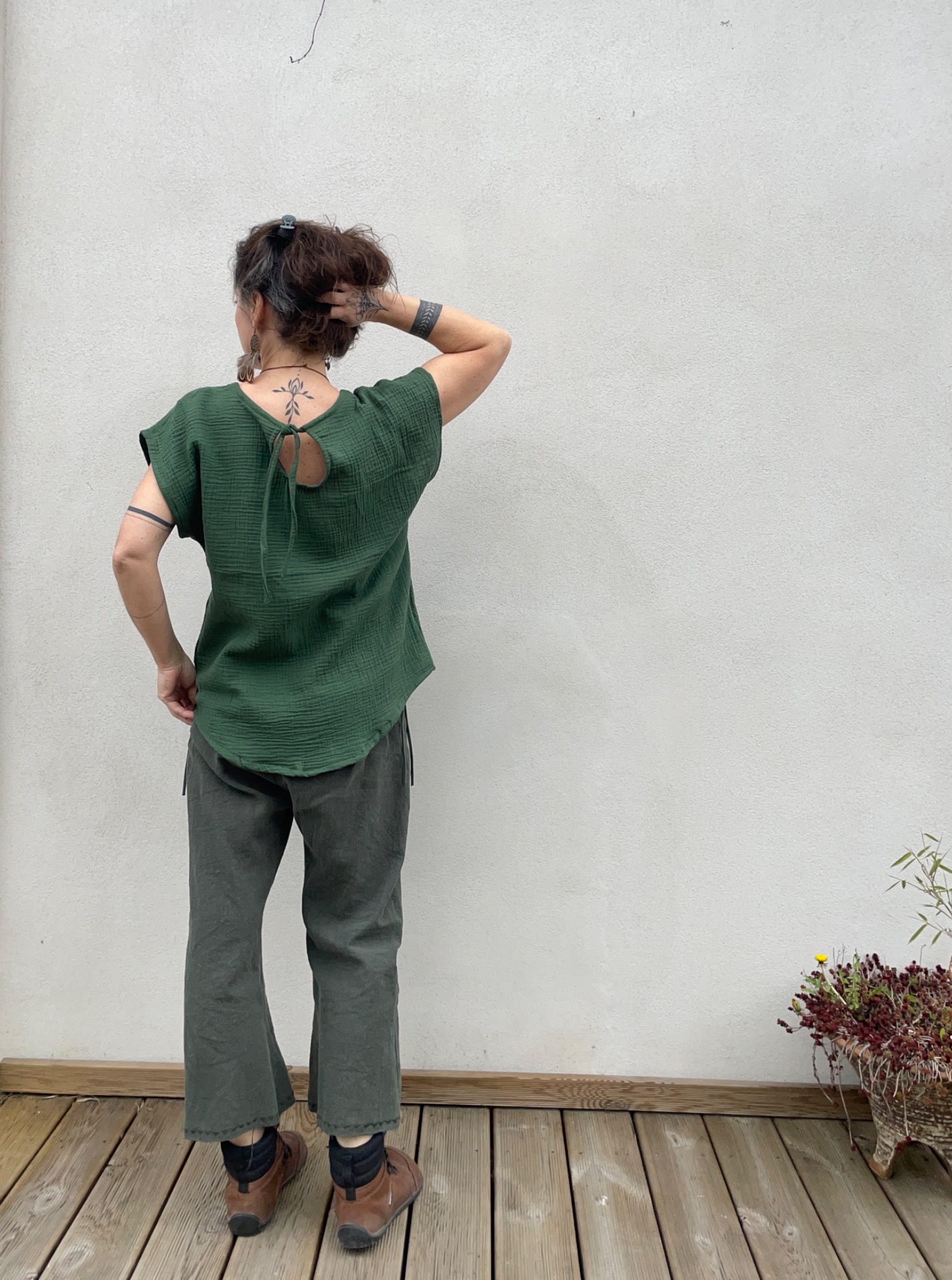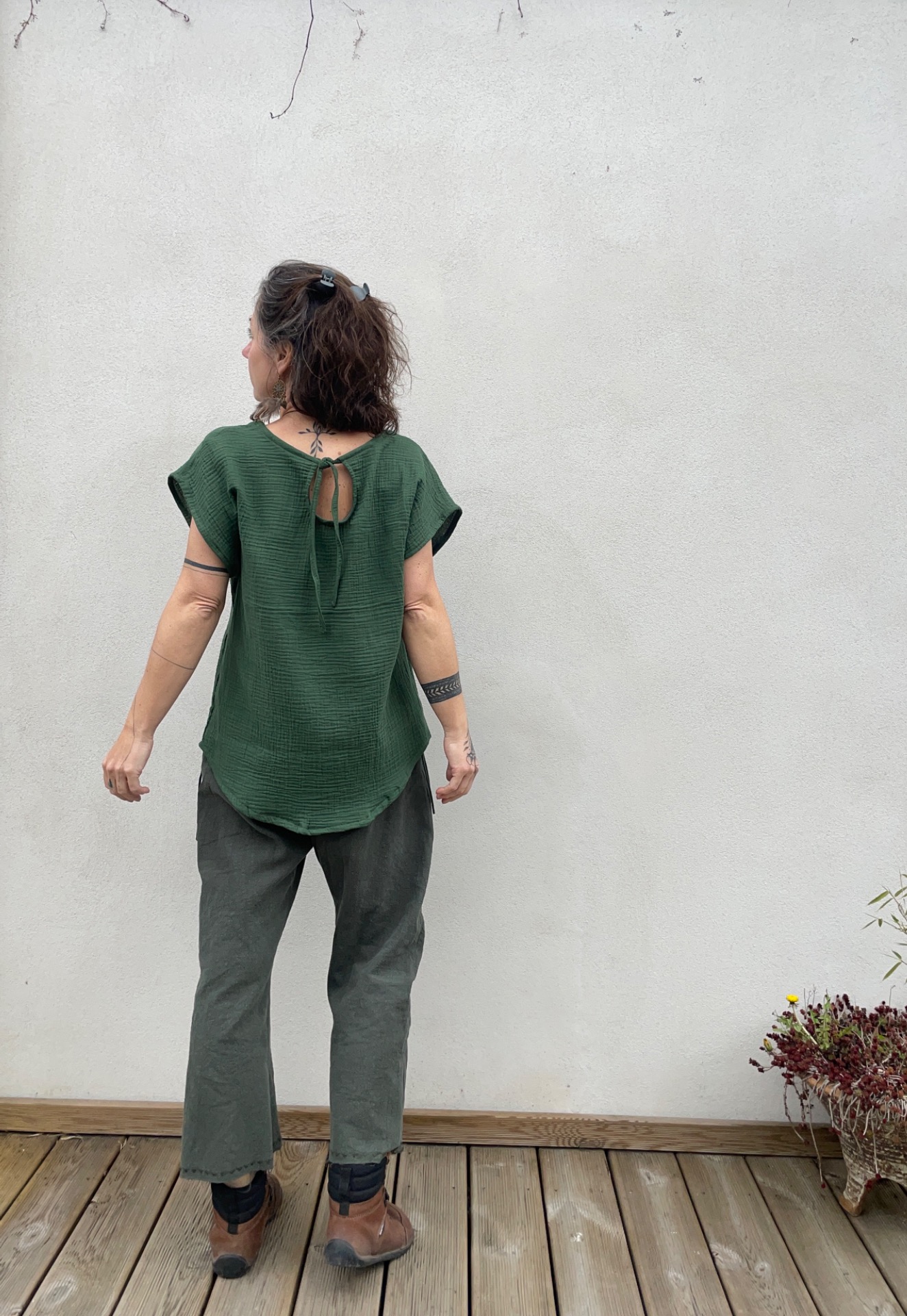 Halenka z mušelínu, střih volný oversize. Vzadu slza na zavazování. dolní okraj do oblouku.