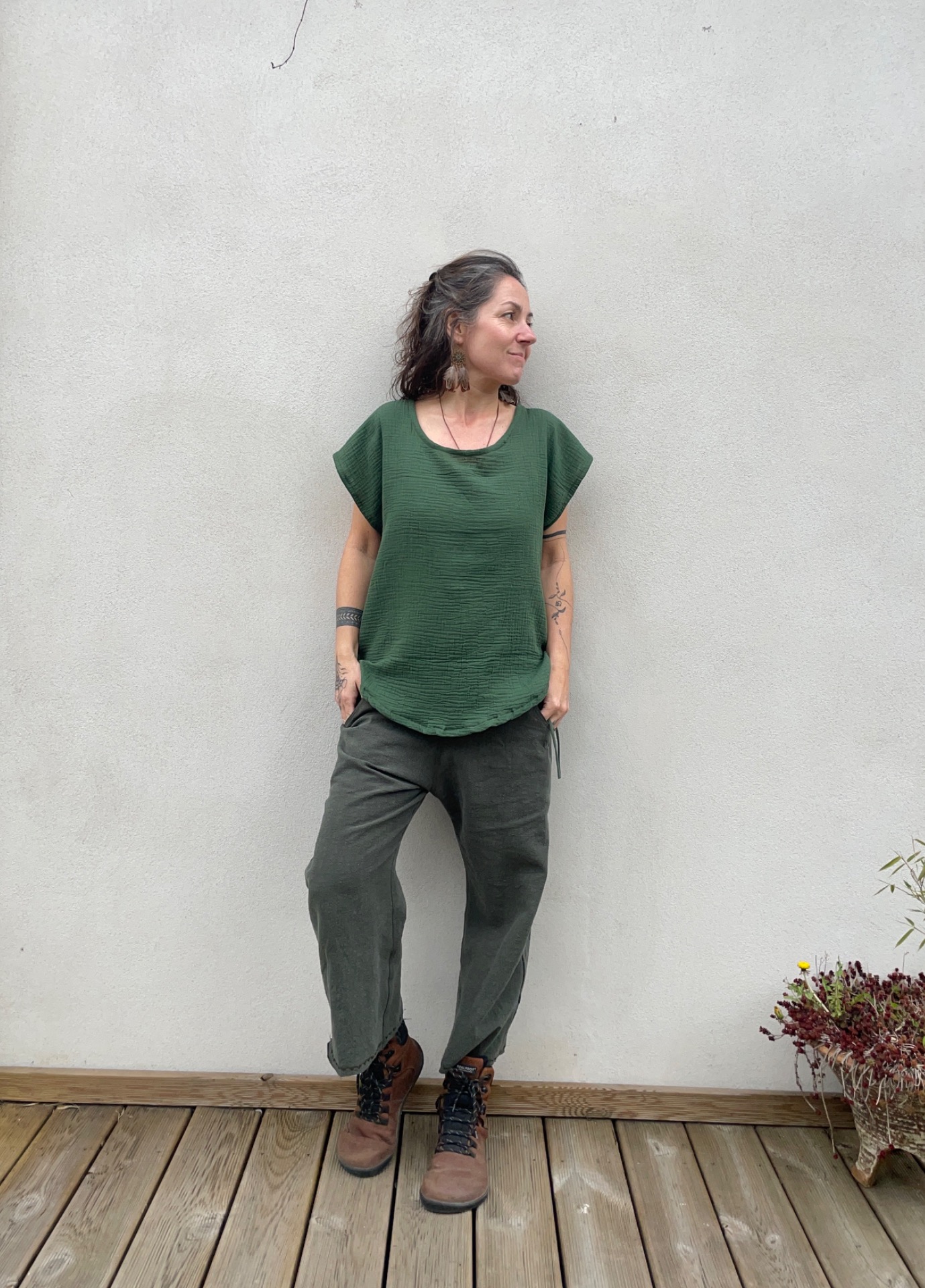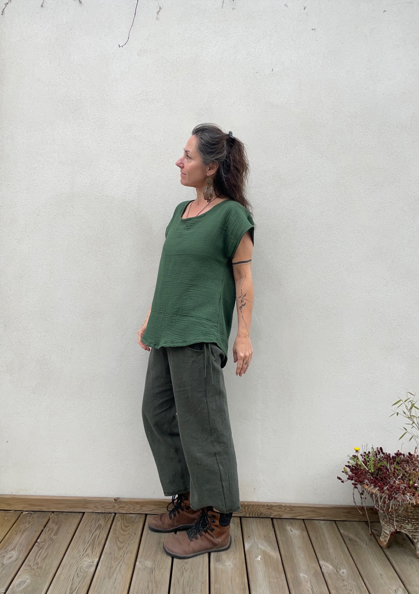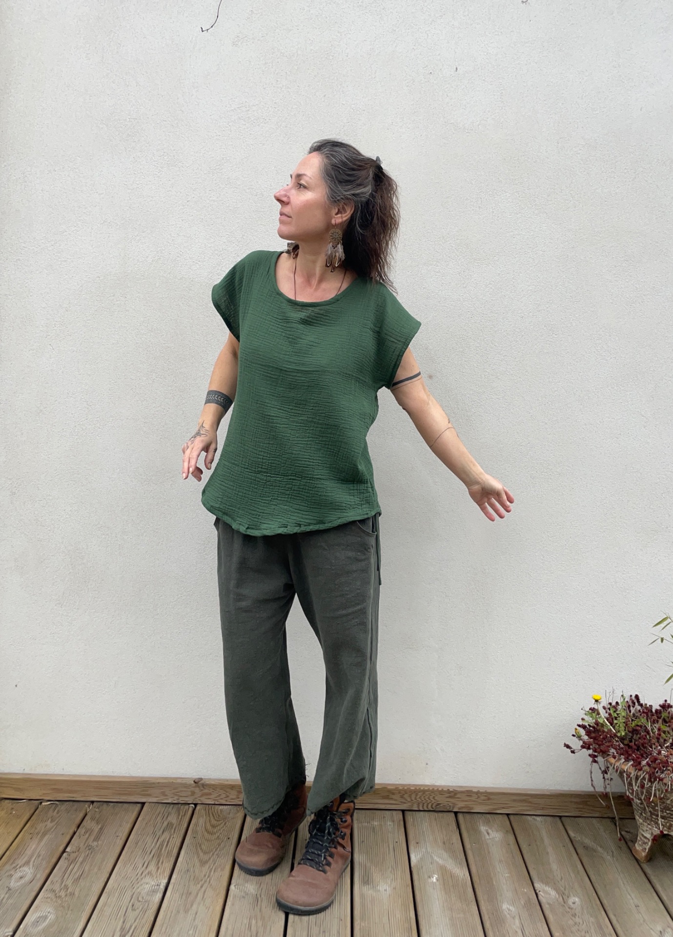 Halenka z mušelínu, střih volný oversize. Vzadu slza na zavazování. dolní okraj do oblouku.