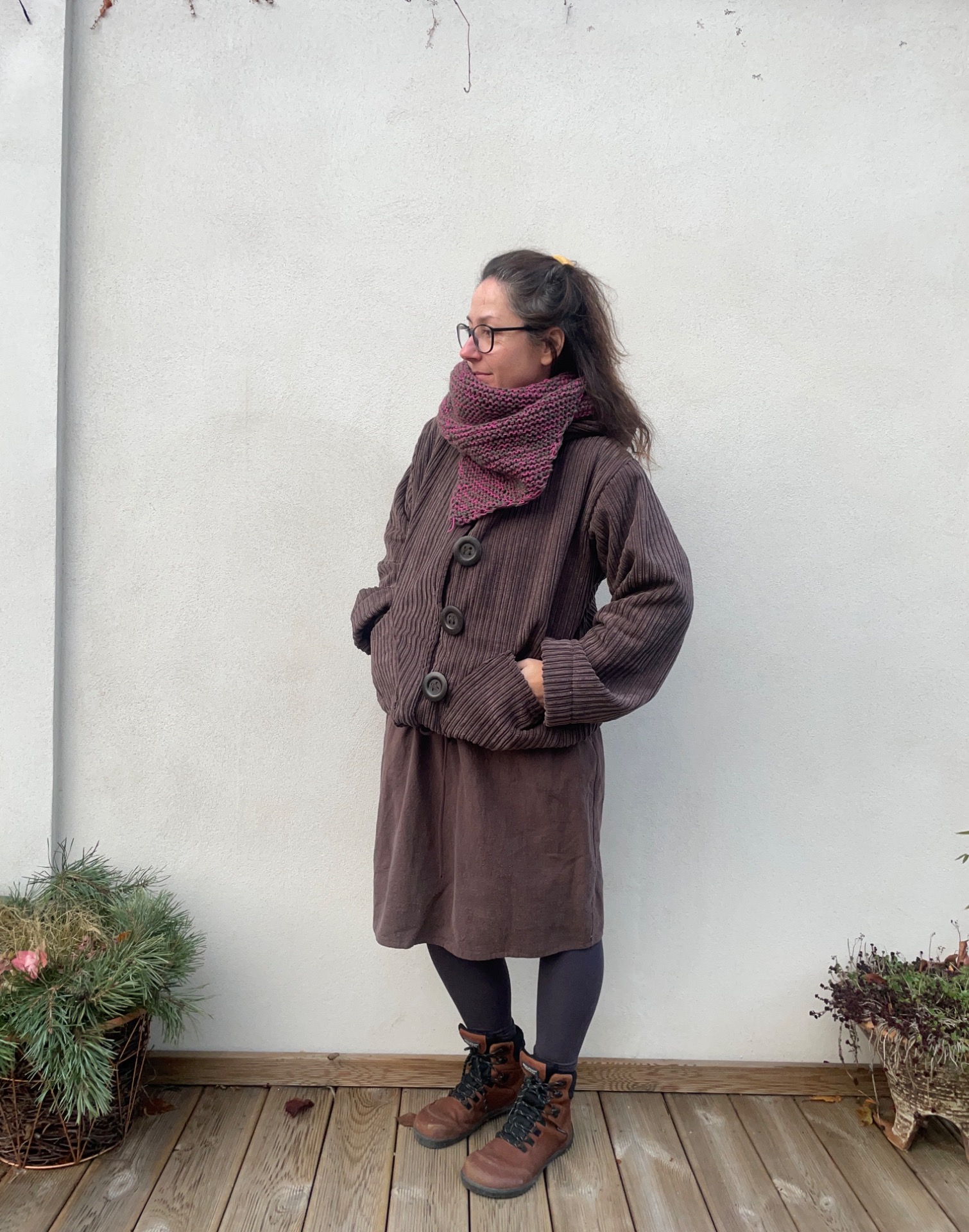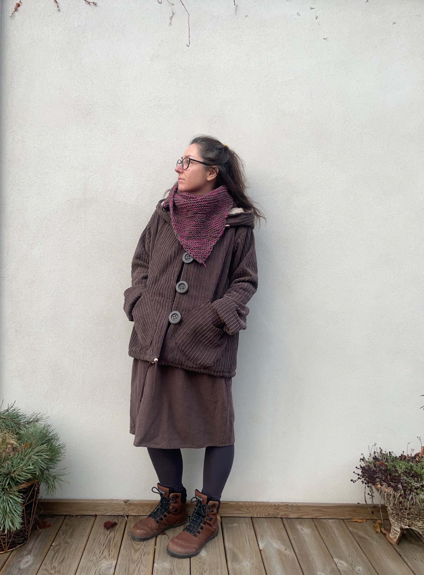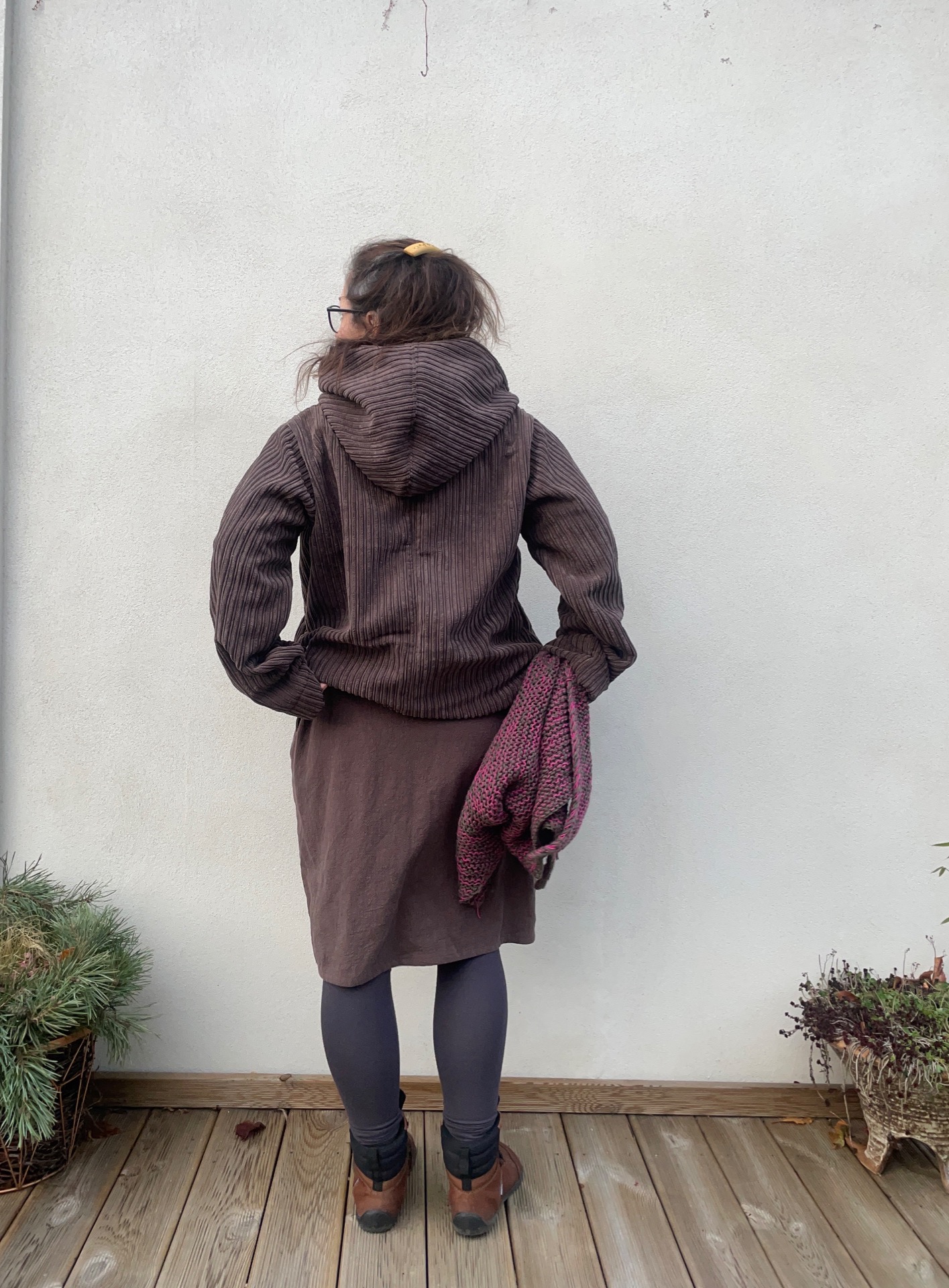 …střih rovný s hlubokými kapsami (uvnitř teplý kožíšek ), veliká hřejivá kapuca ,zapínaní na dřevěné knofliky hezky umocní pohodový vzhled kabátku …kapuca se zapíná na knoflík vytvořený z avokáda, dolní okraj je vpředu na stahovaní ( podle potřeby lze celý podkasat a zvolit tak krátkou délku do pasu )