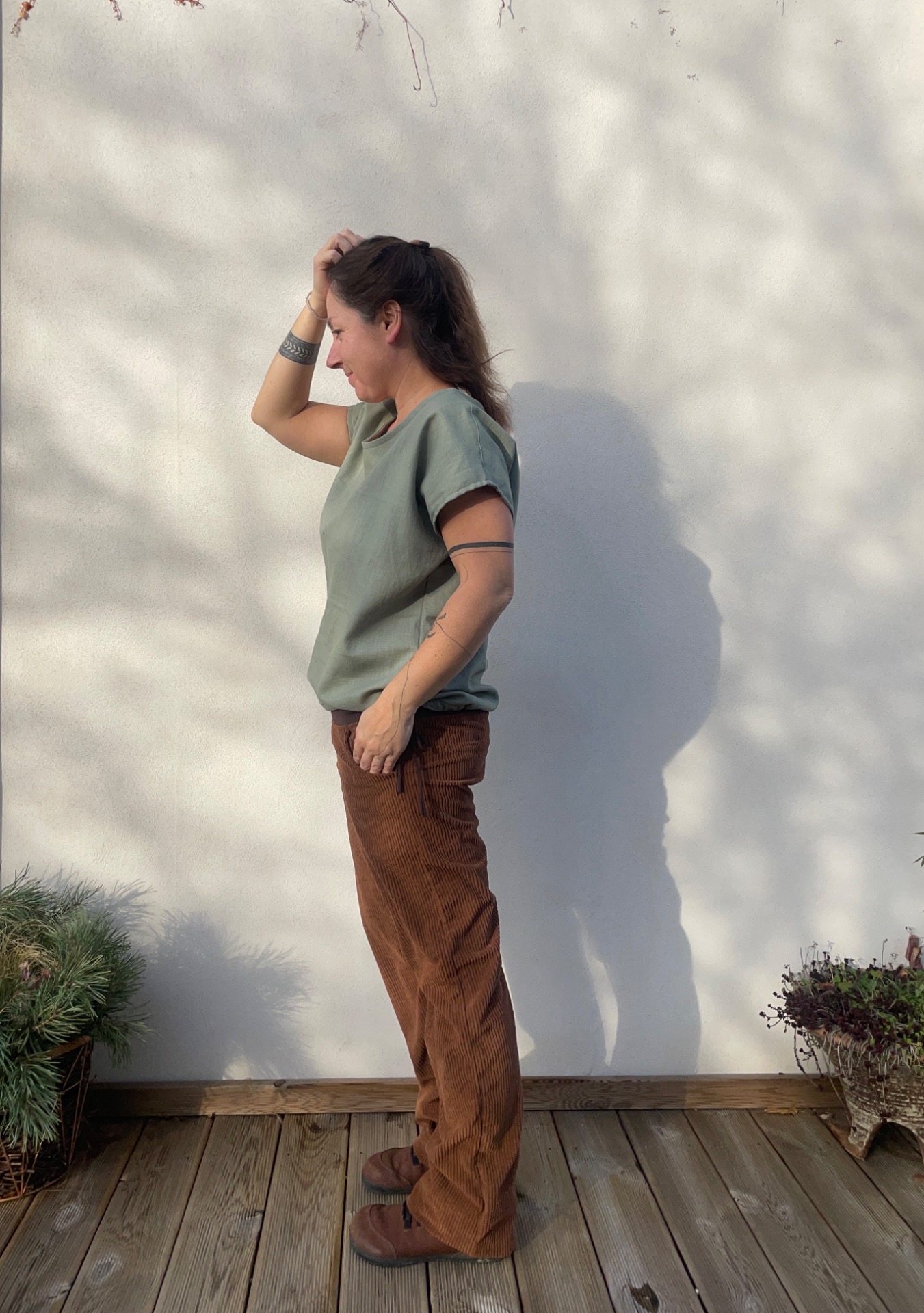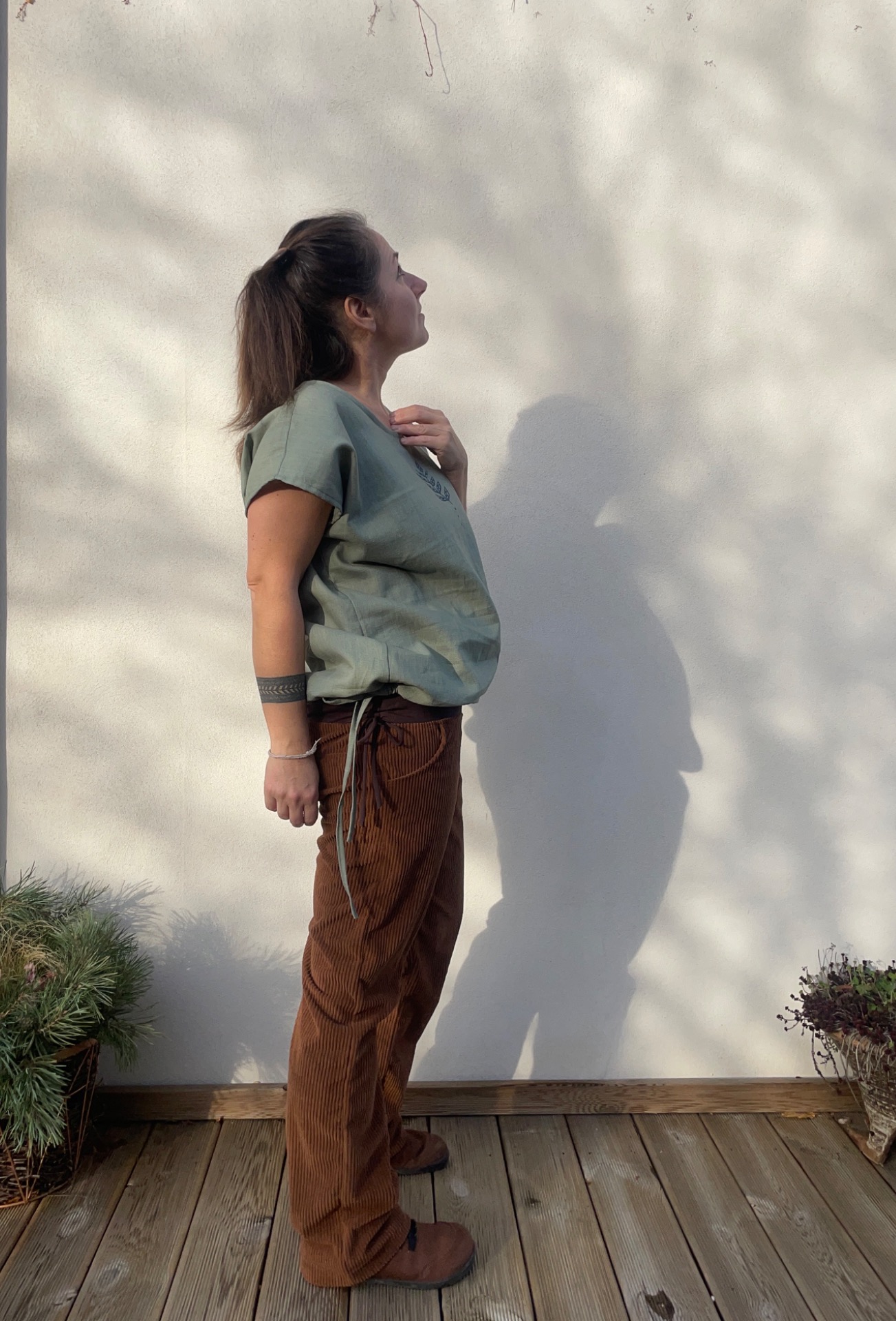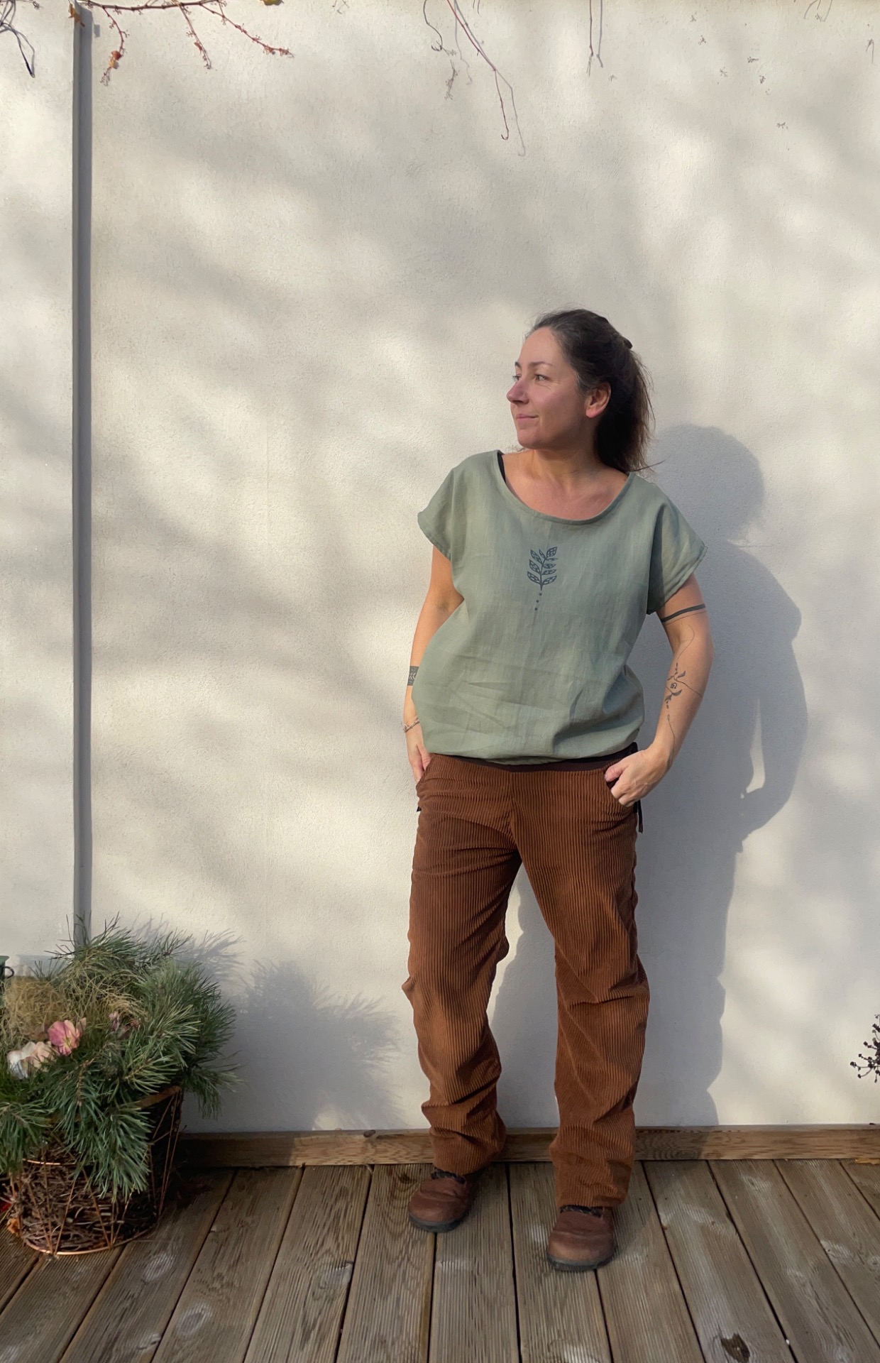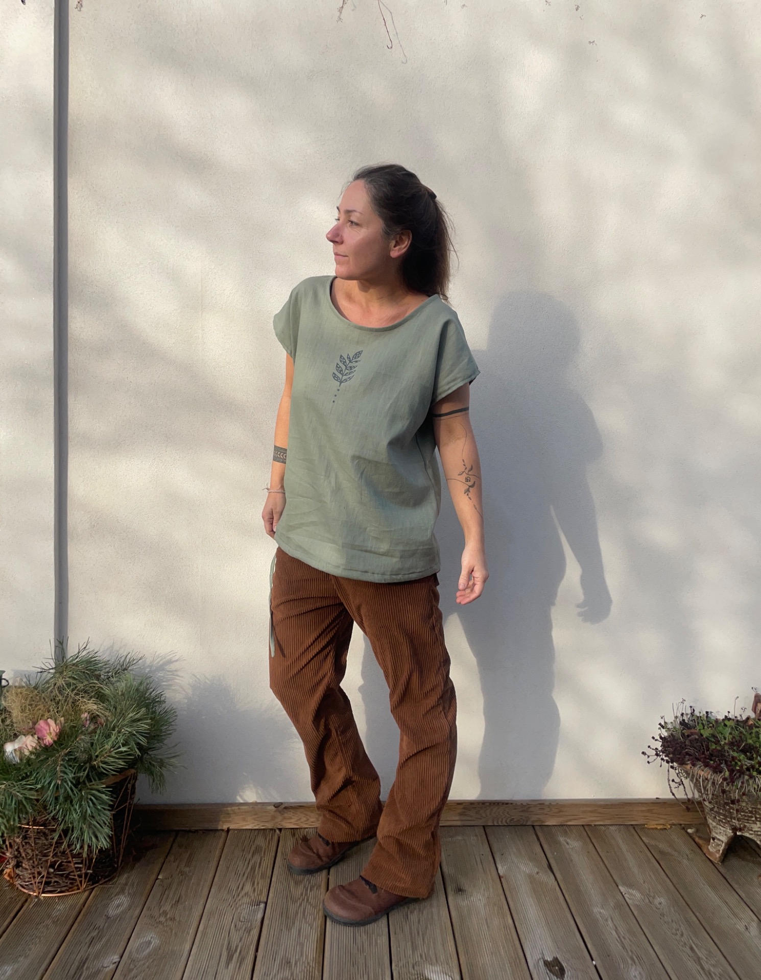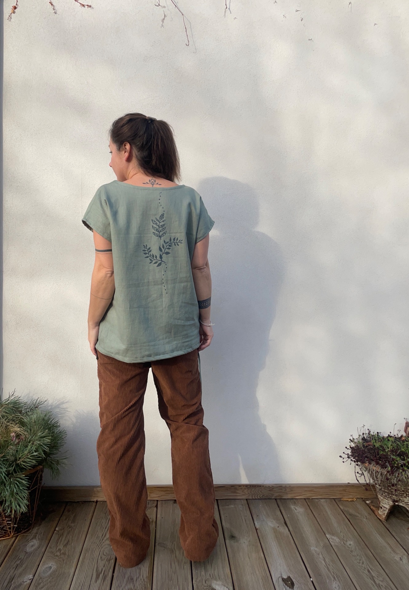 lněná halenka šalvějové barvy s přinechanými rukávy, rovného střihu, v dolním okraji na stahování, výstřih akorát ….tisk vpředu i vzadu