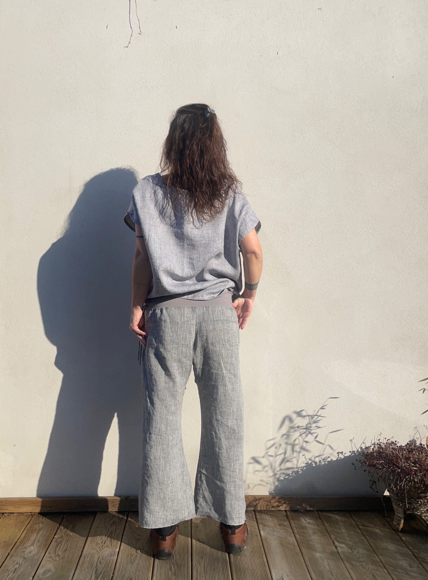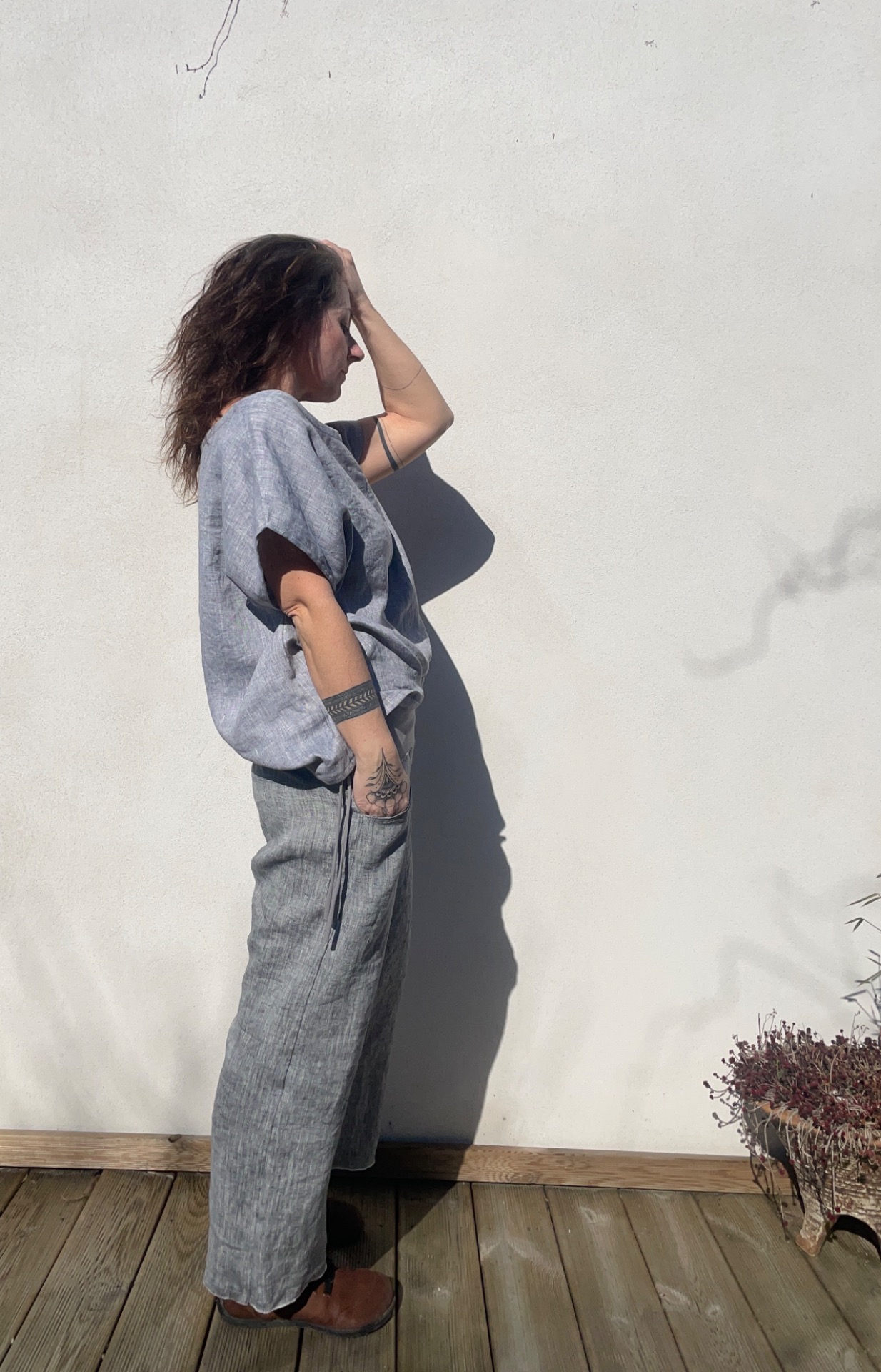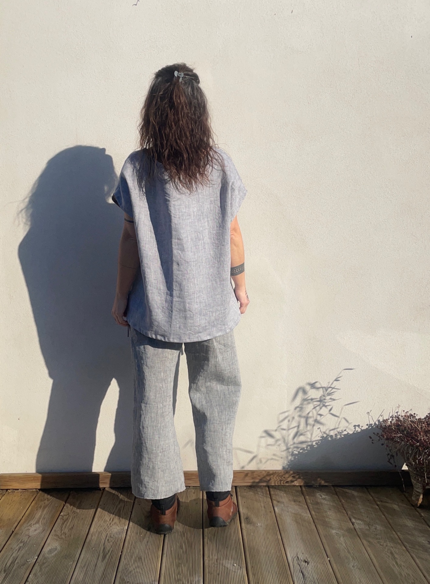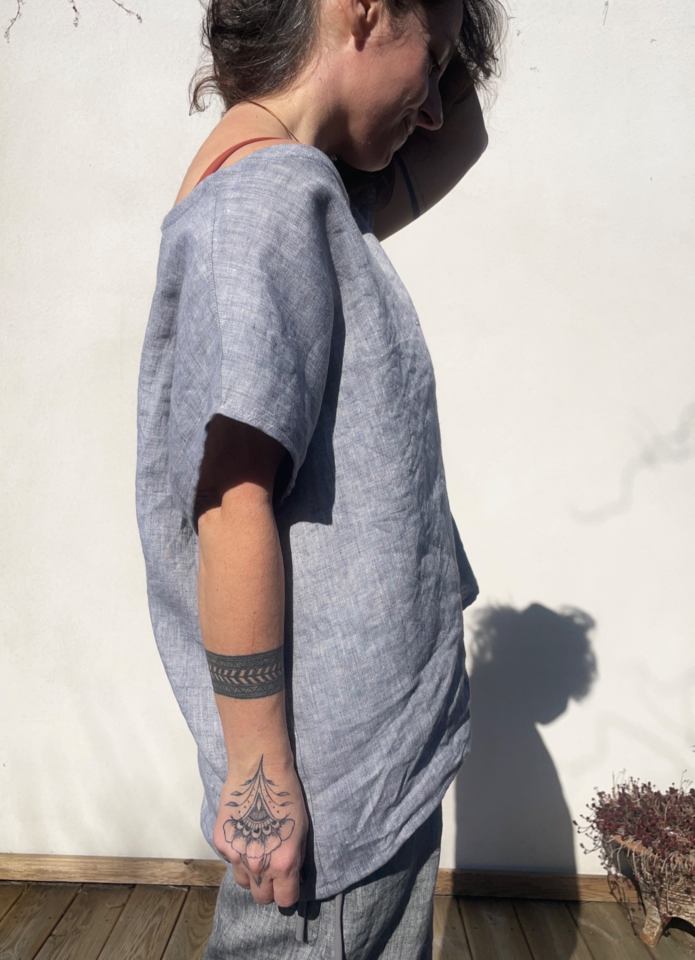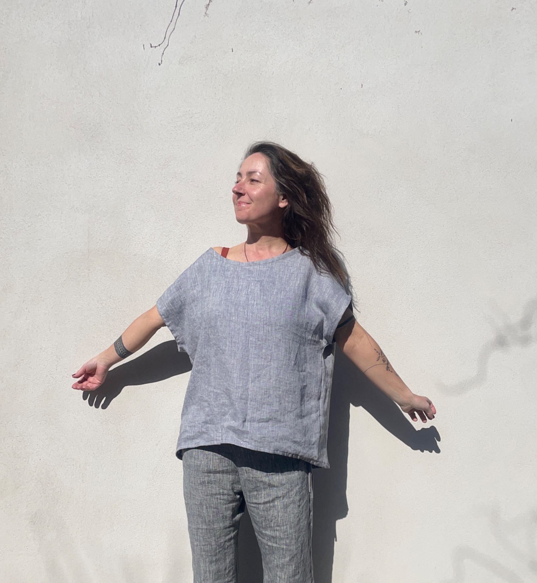 Široká vzdušná halenka z světle šedého melírovaného lnu. Střih oversize . velikost univerzální