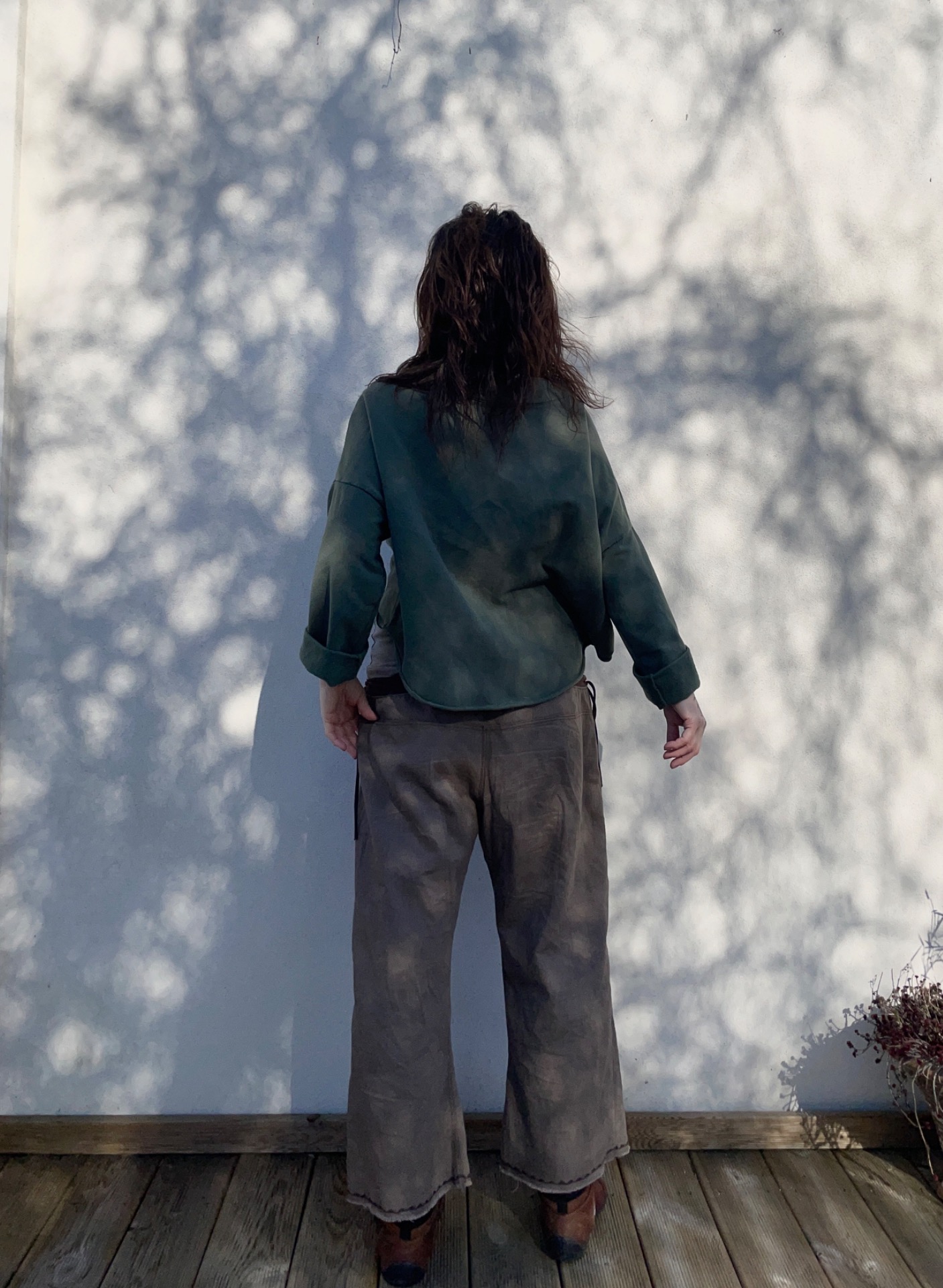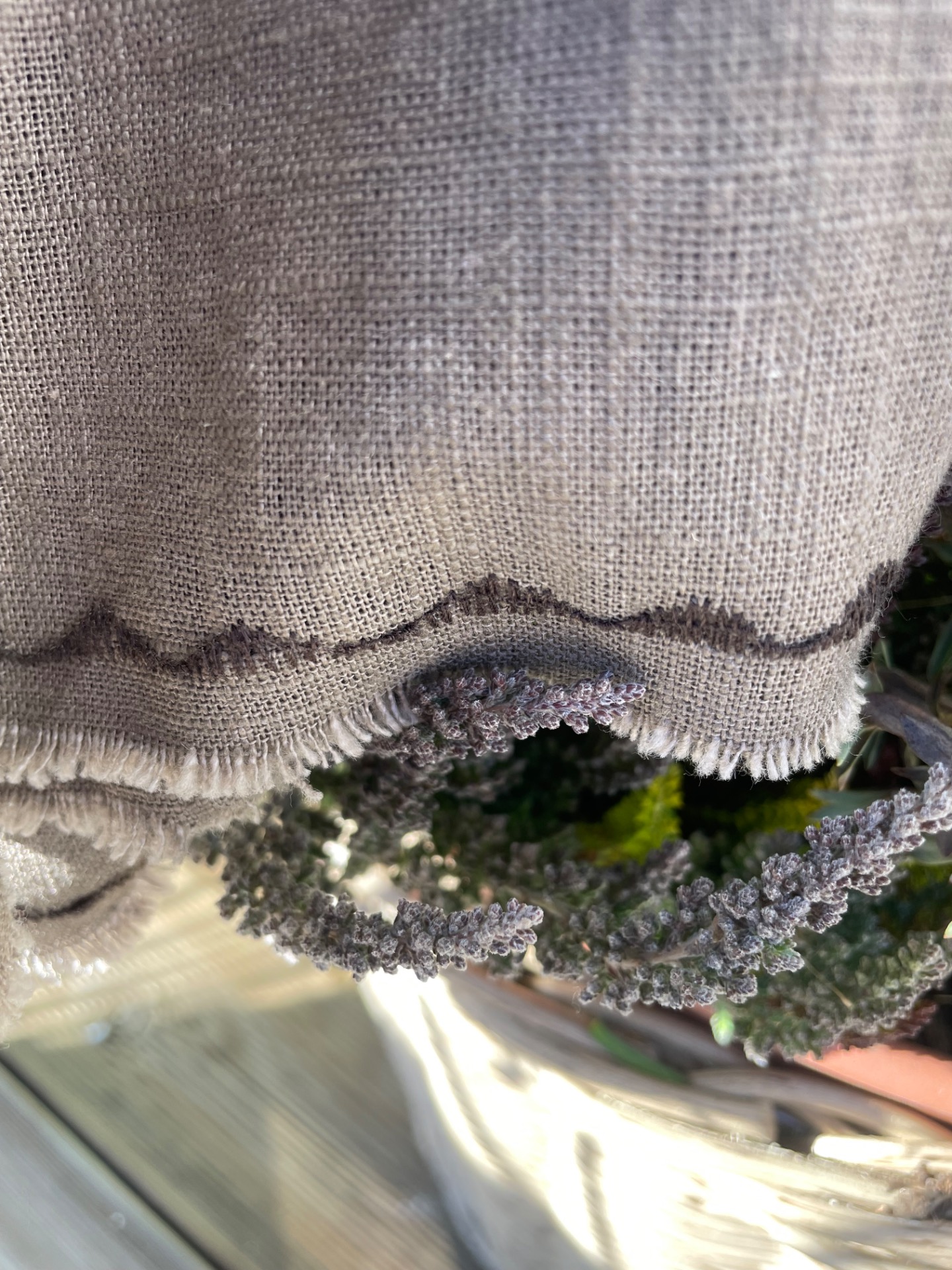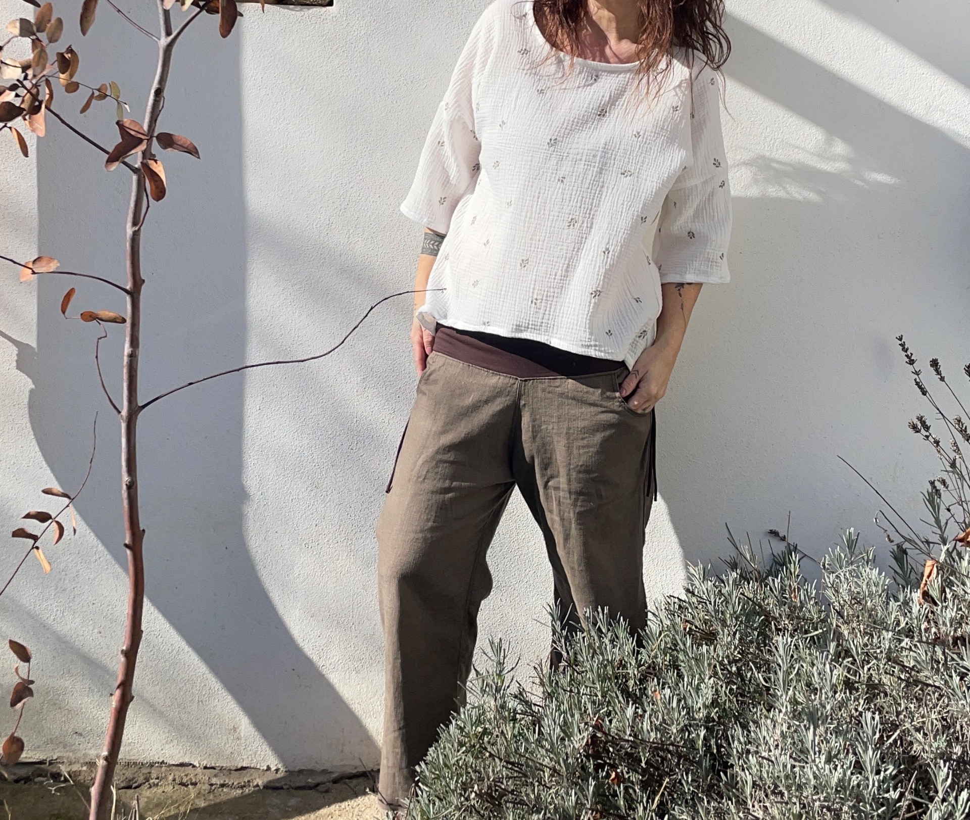 Spodní část dole u kalhot je úmyslně zakončena výšivkou a třepením lněného materiálu…důmyslně tsk vytváří efekt ledabylého stylu.