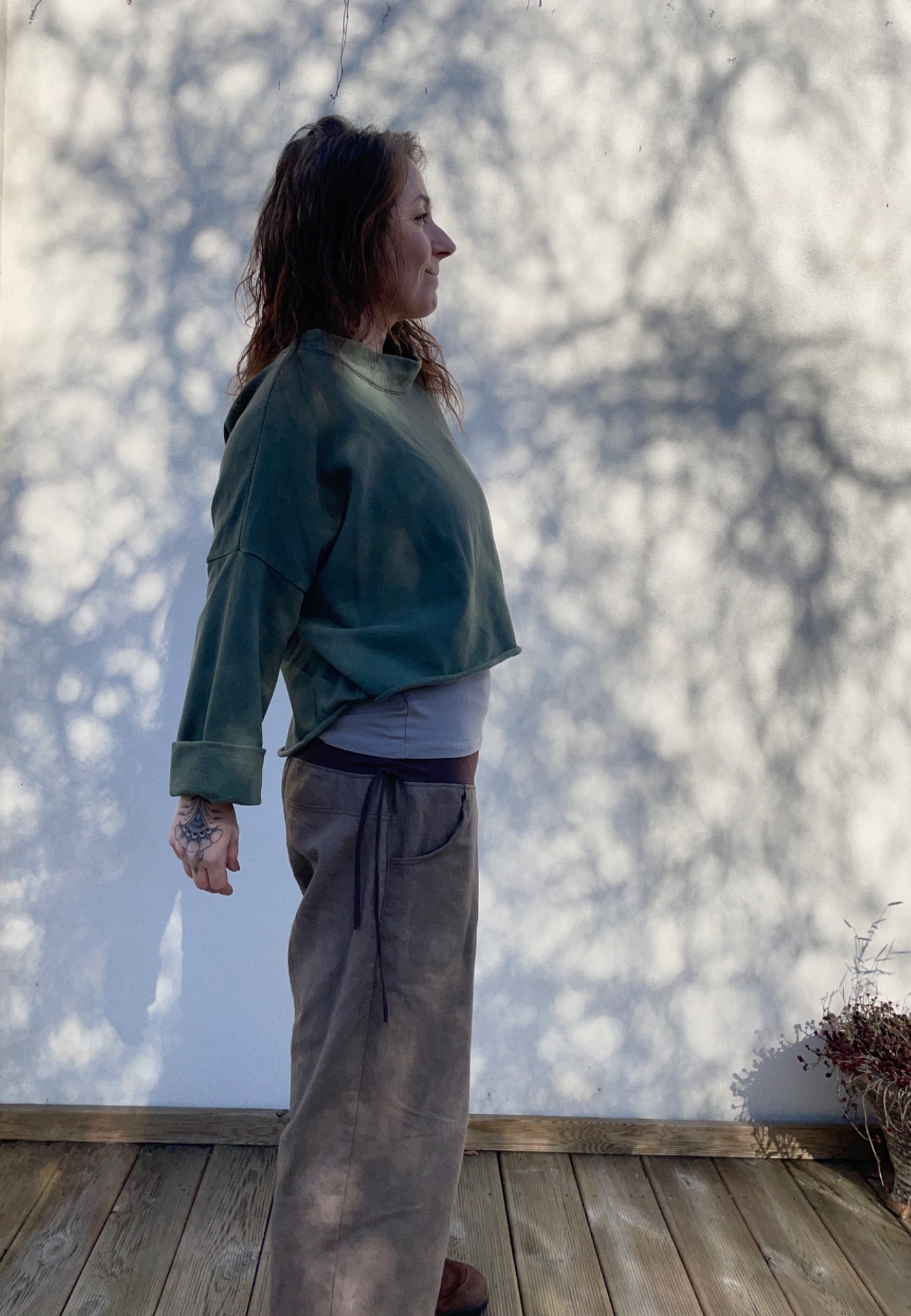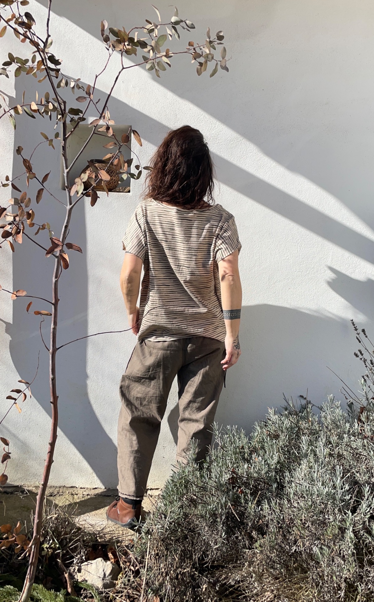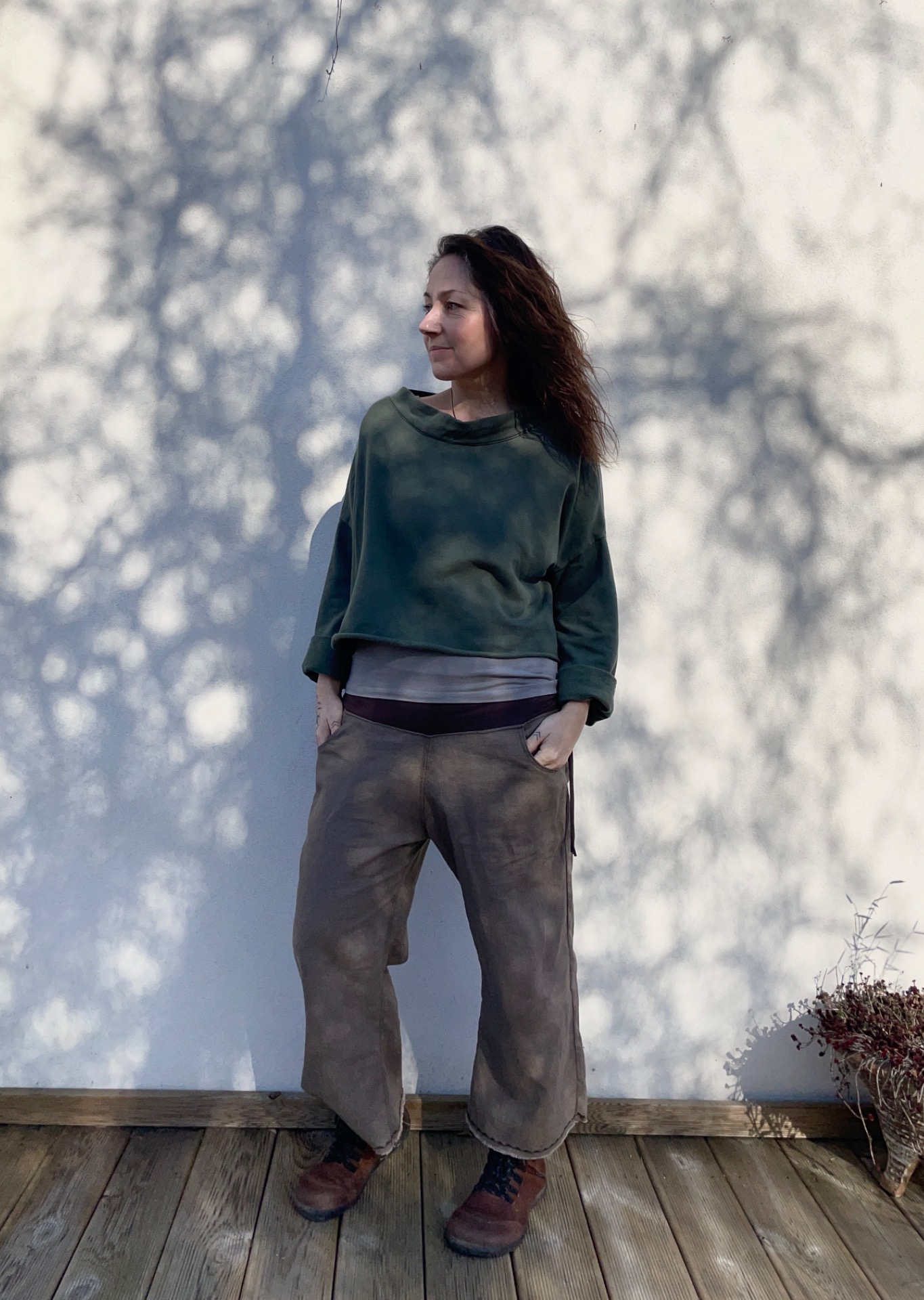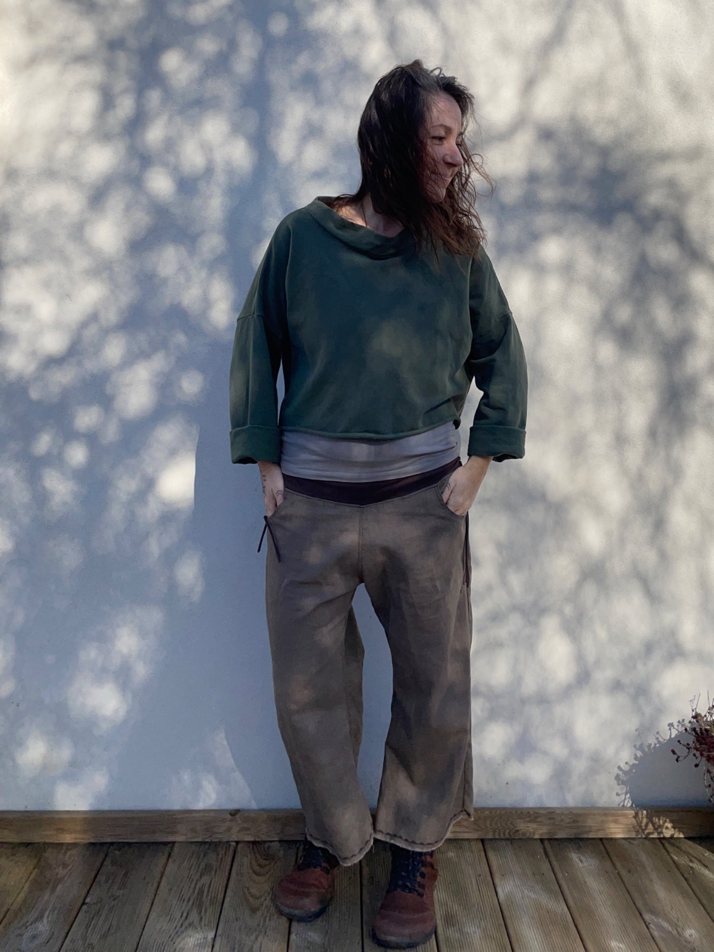 Spodní část dole u kalhot je úmyslně zakončena výšivkou a třepením lněného materiálu…důmyslně tsk vytváří efekt ledabylého stylu.