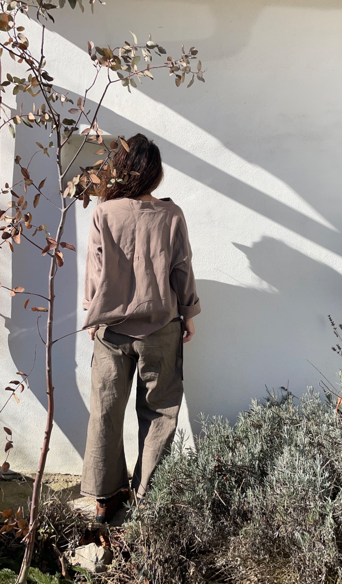 Široké lněné kalhoty s kapsama vpředu. Pohodlný volný střih, v pase elegantně zakončené do pružného úpletu, v bocích stažení šňůrkami.
