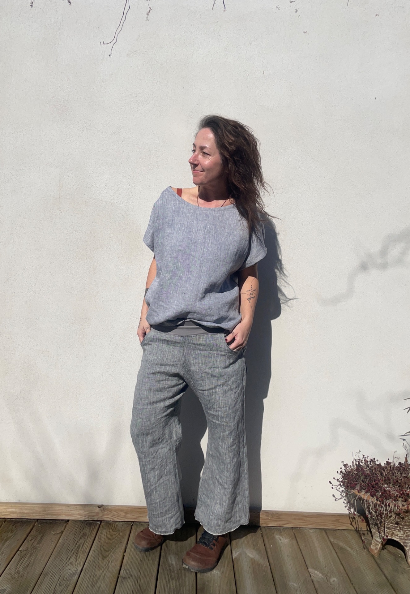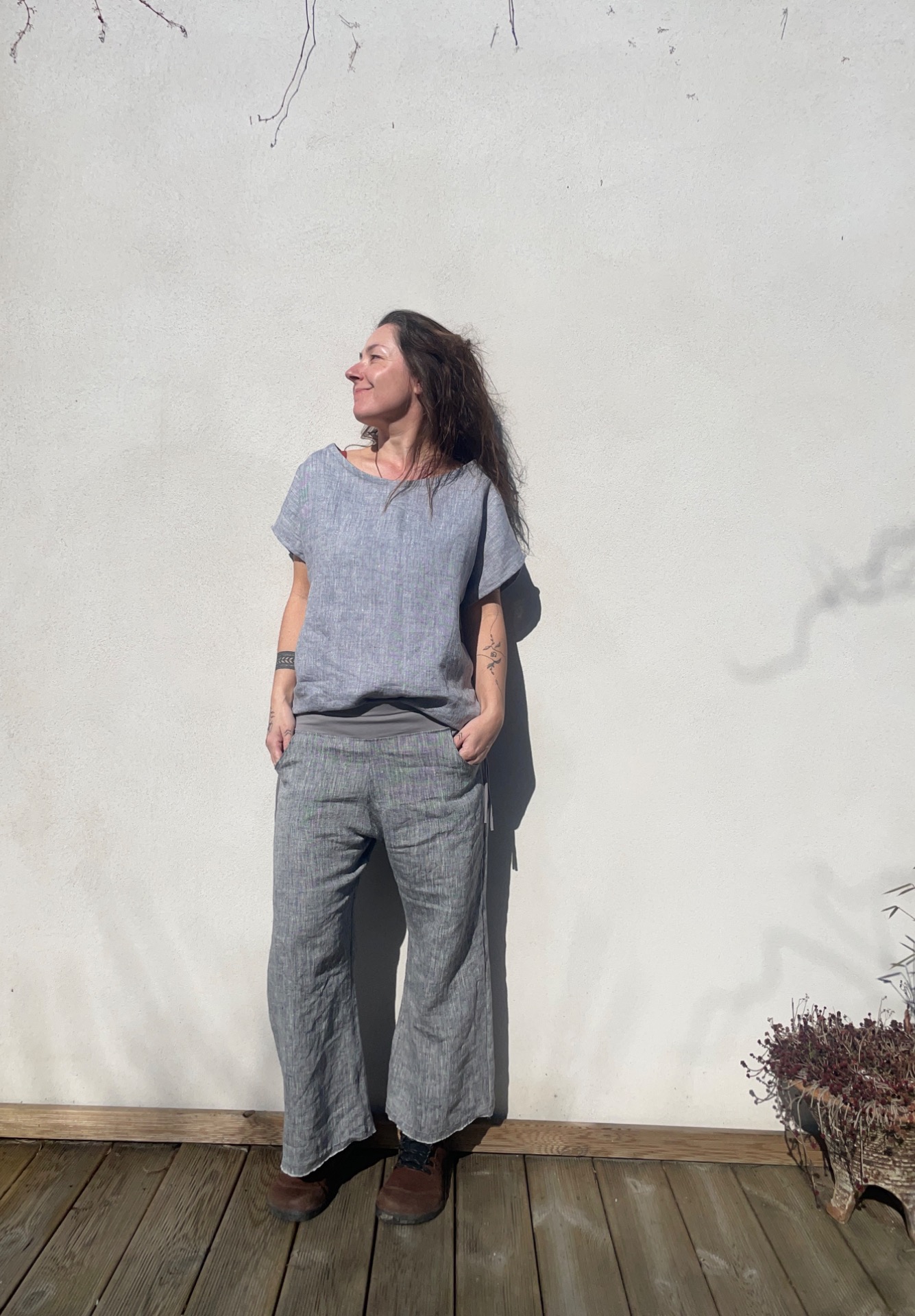 Široké lněné kalhoty s kapsama vpředu. Pohodlný volný střih, v pase elegantně zakončené do pružného úpletu, v bocích stažení šňůrkami.