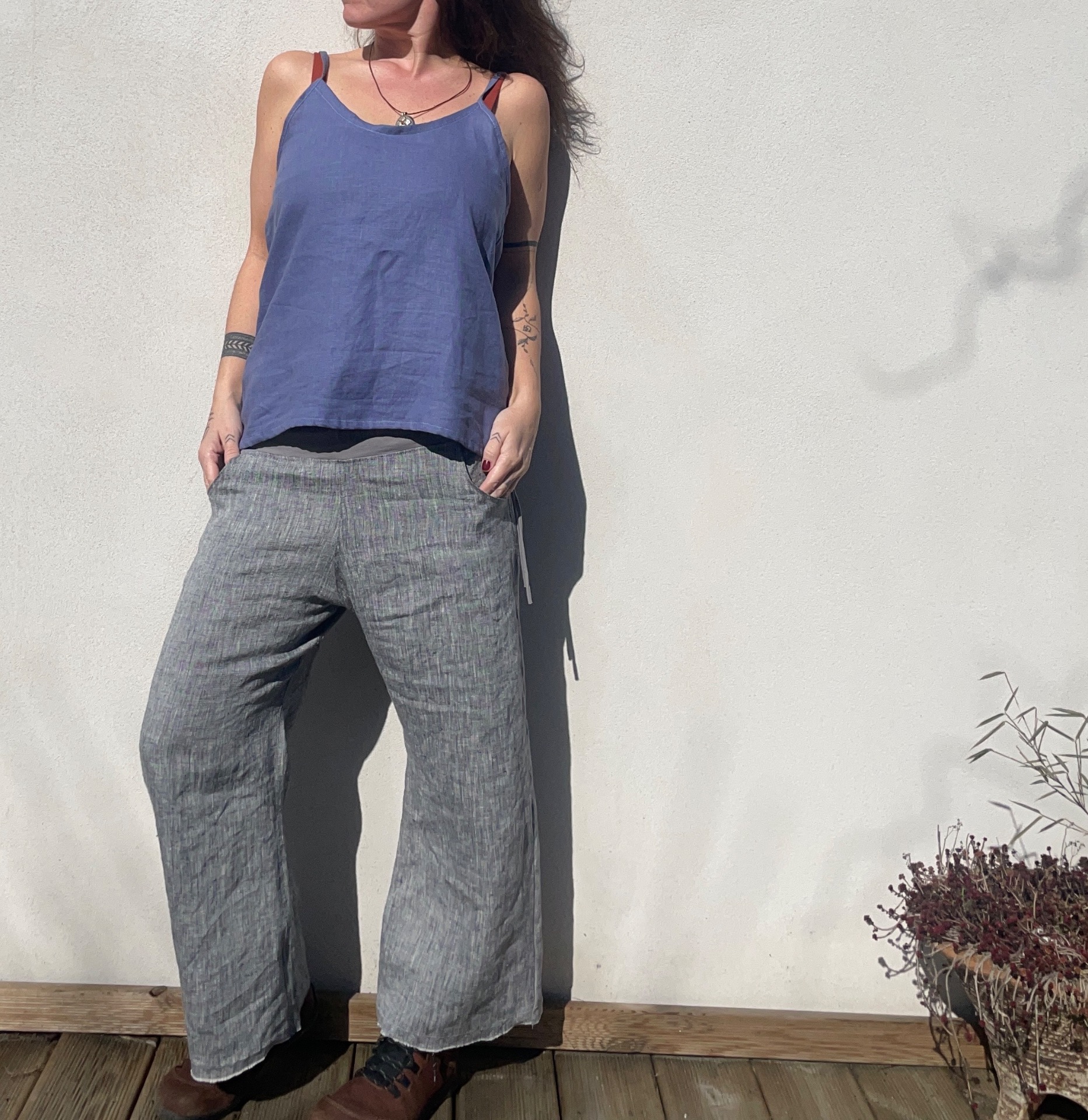 Spodní část dole u kalhot je úmyslně zakončena výšivkou a třepením lněného materiálu…důmyslně tsk vytváří efekt ledabylého stylu.