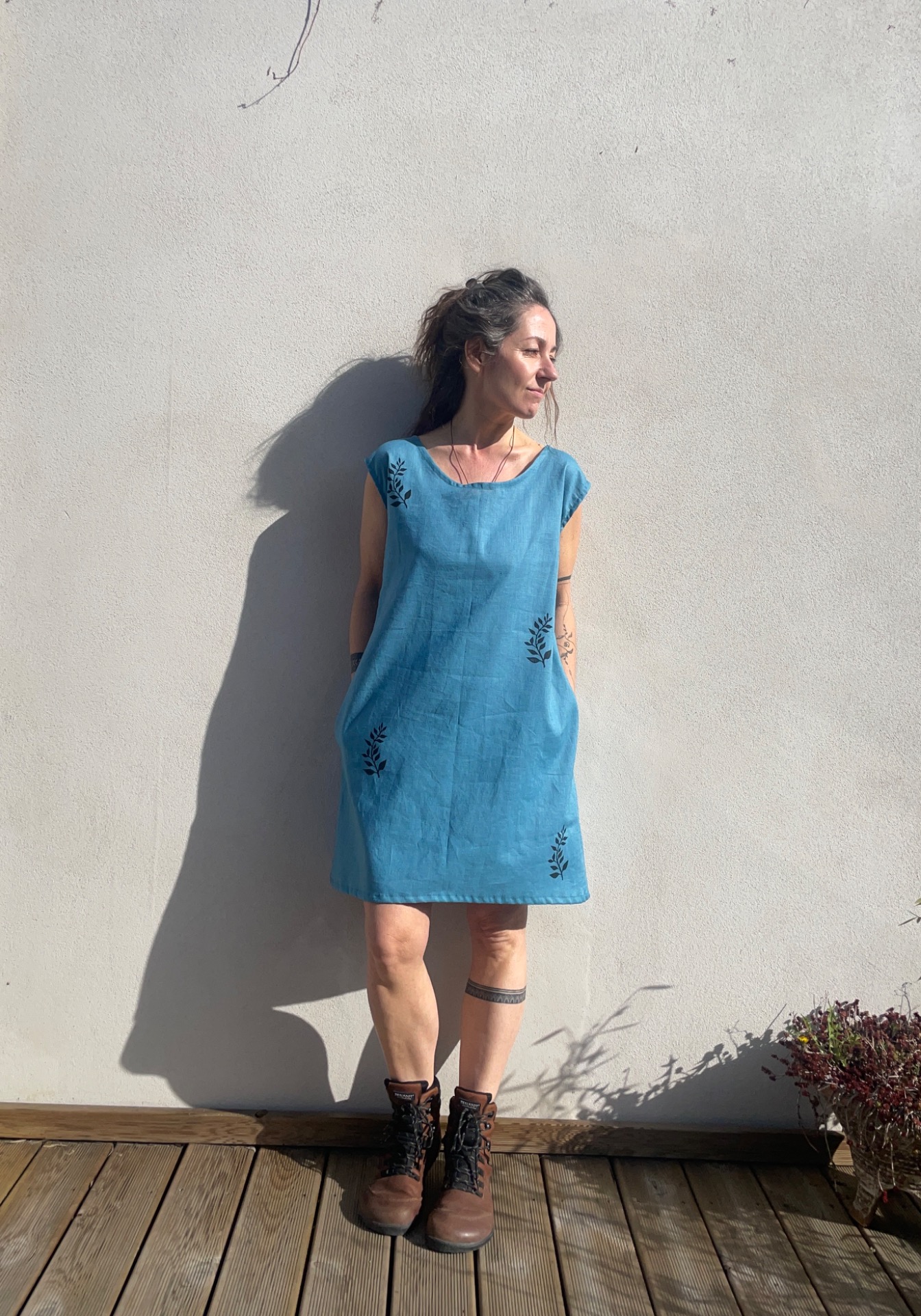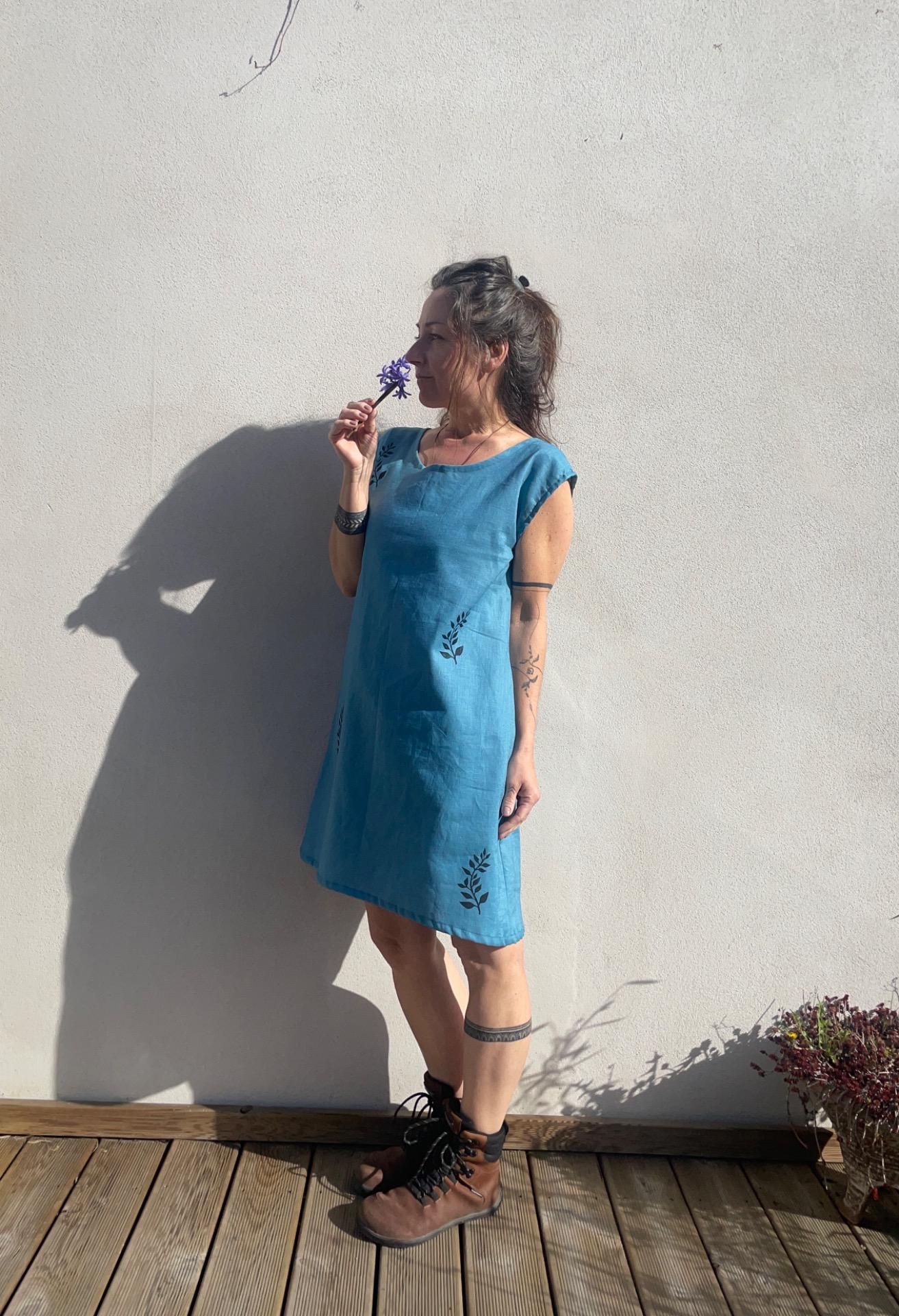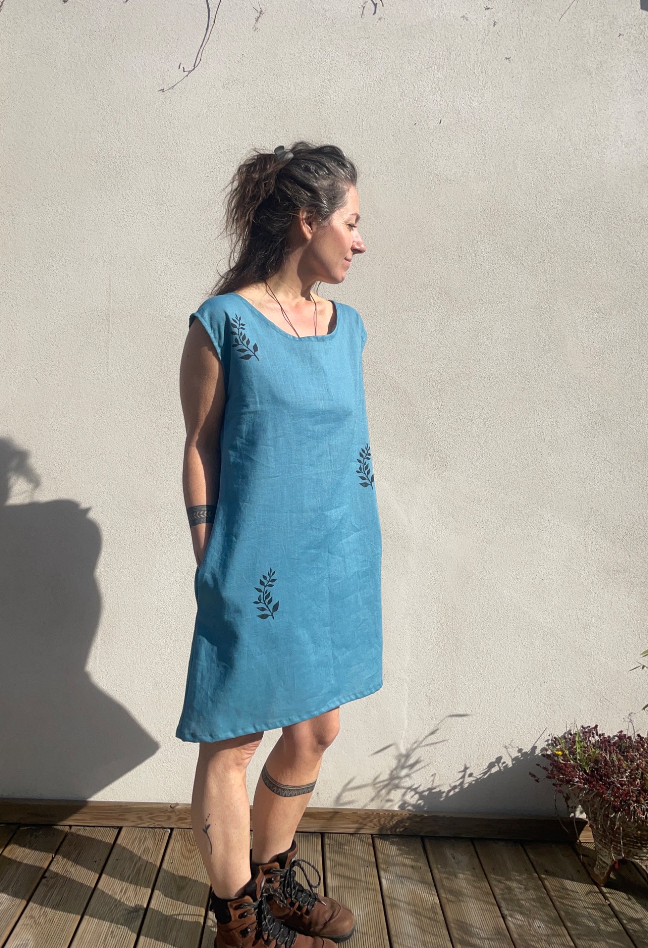 Lněné šaty jednoduchejo áčkového střihu, s kapsami, rukávy přenechané, výstřih letní . S tiskem ručně vyřezávaných linorytů.