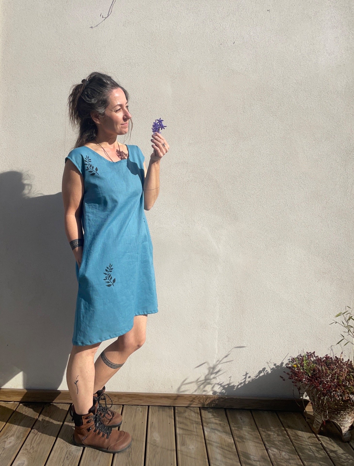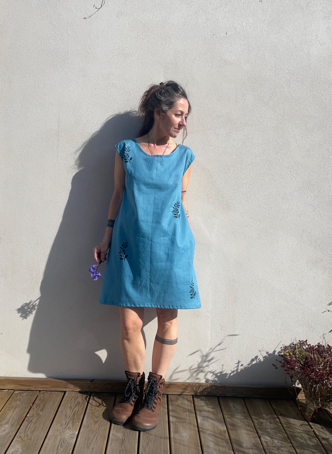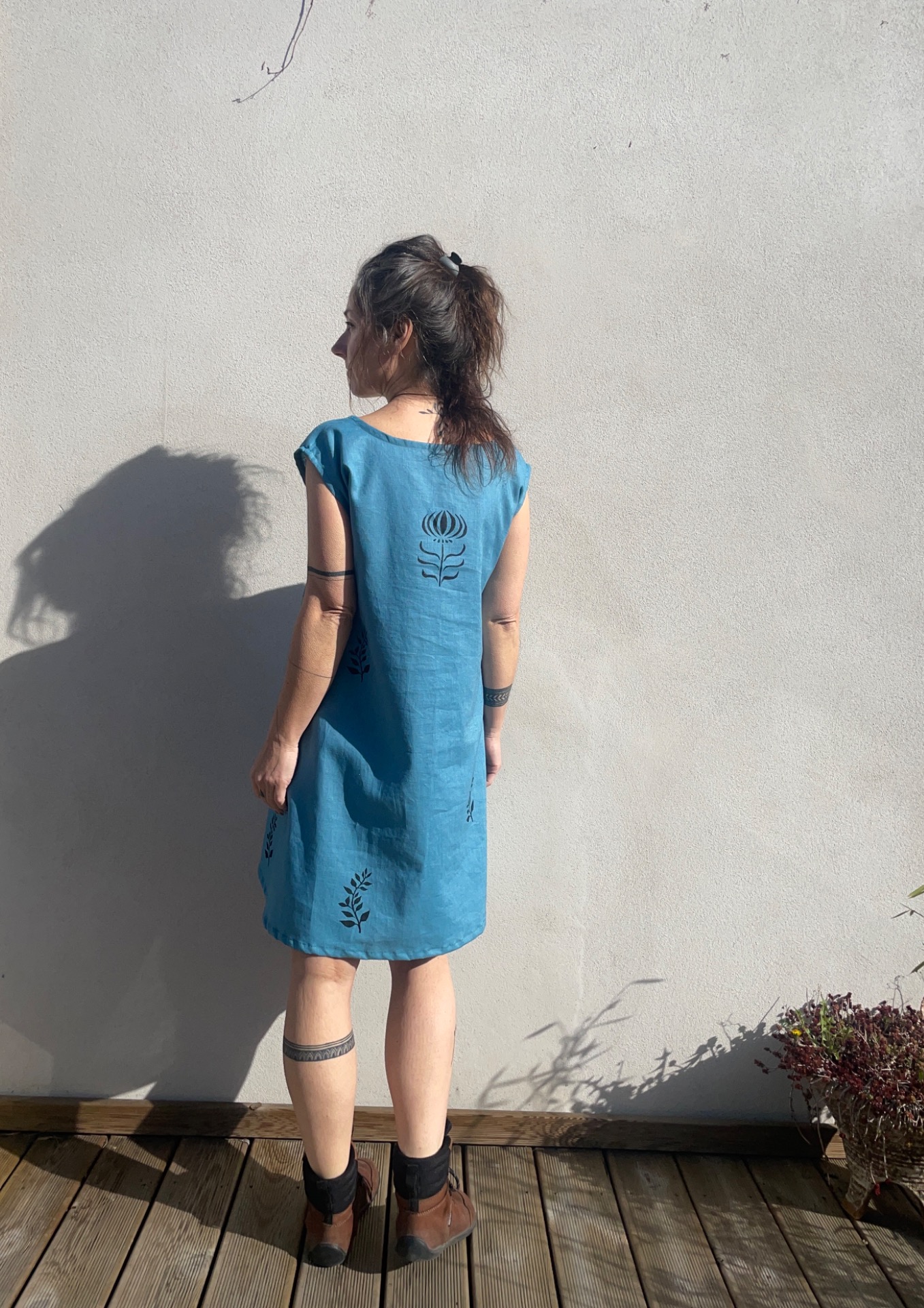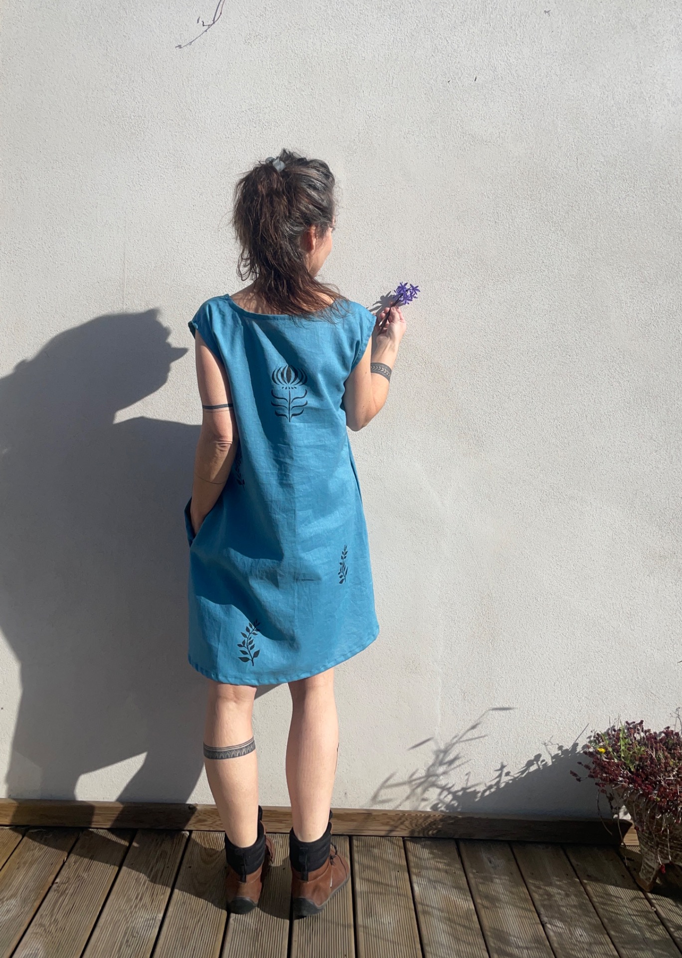 Lněné šaty jednoduchejo áčkového střihu, s kapsami, rukávy přenechané, výstřih letní . S tiskem ručně vyřezávaných linorytů.
