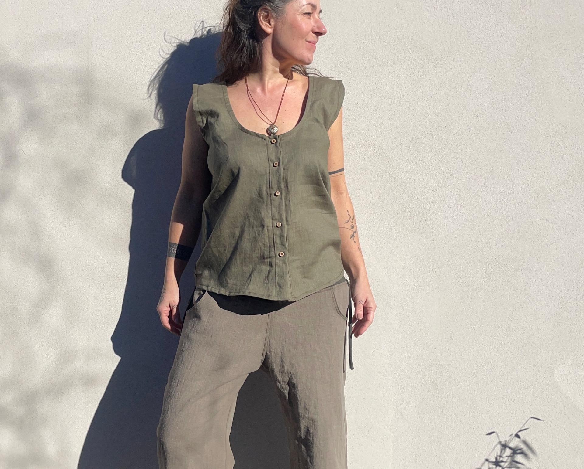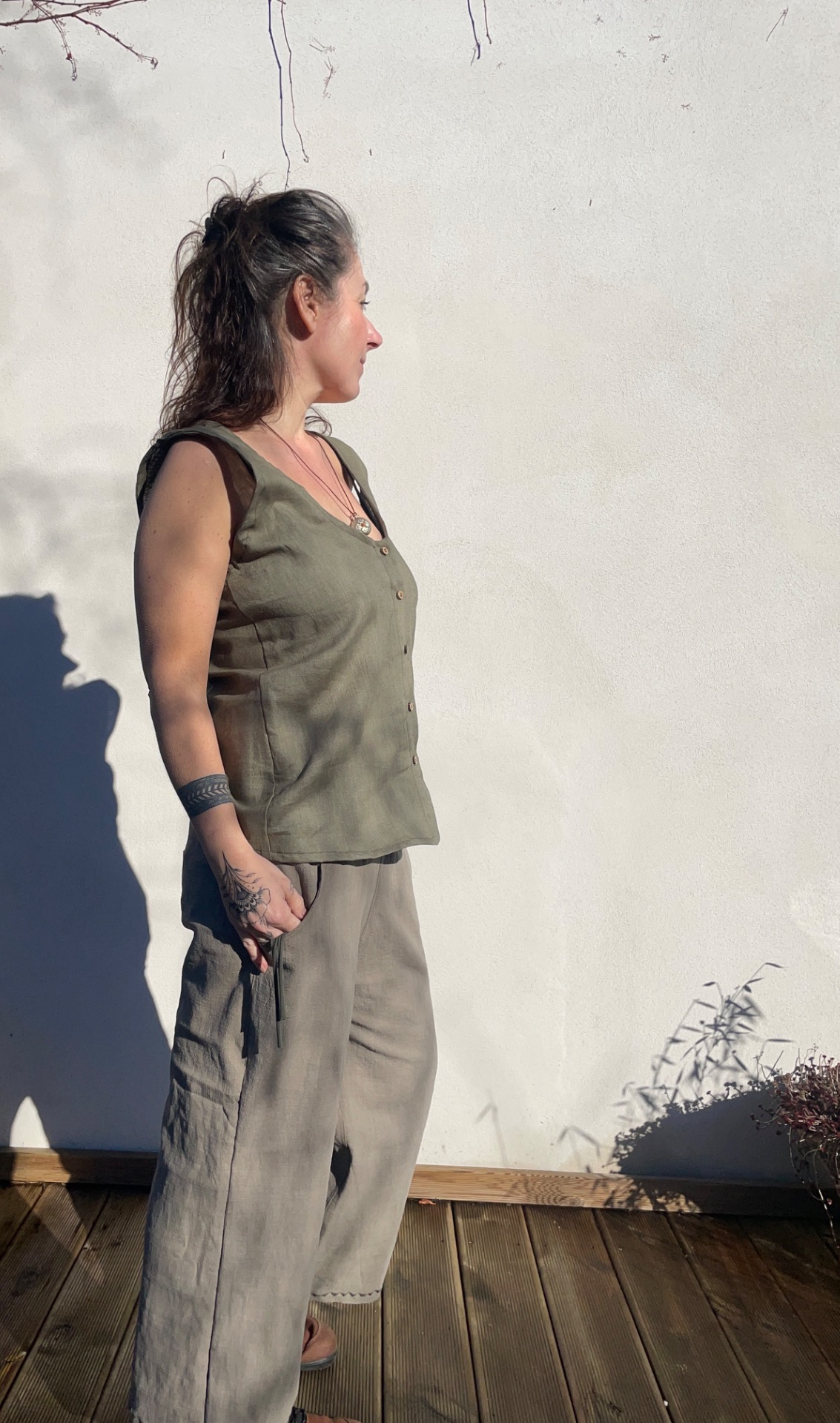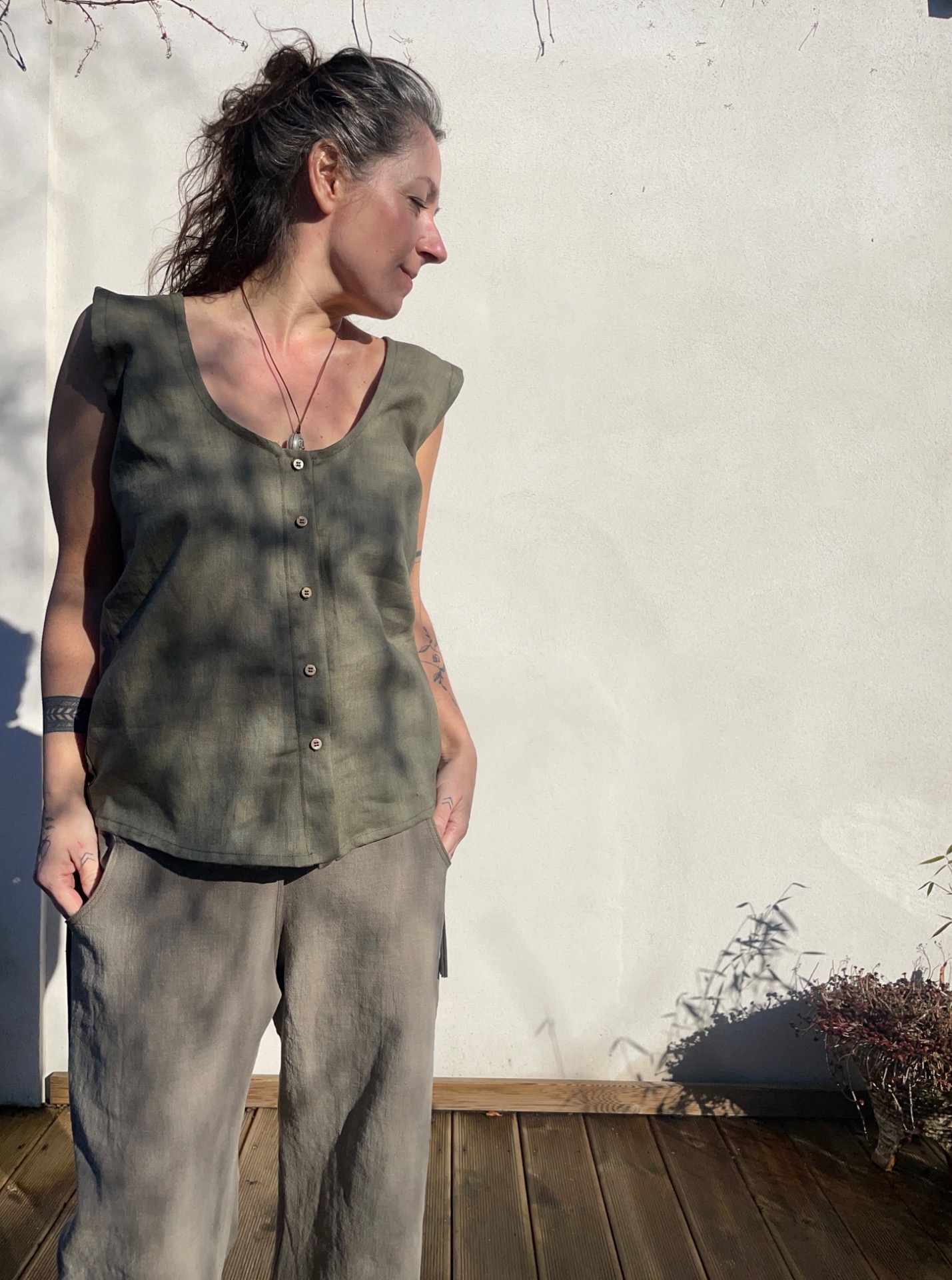 lněný top rozepínací s malinkými dřevěnými knoflíky, v předním díle je lehce delší