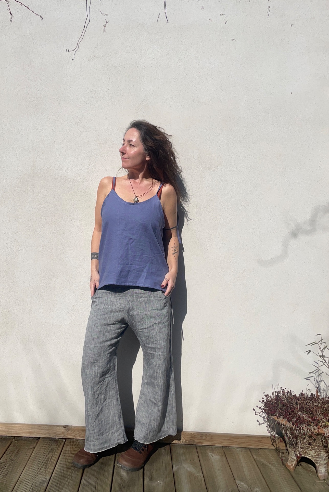 Lněný top v barvě holubí modř, ramínka na zavazování