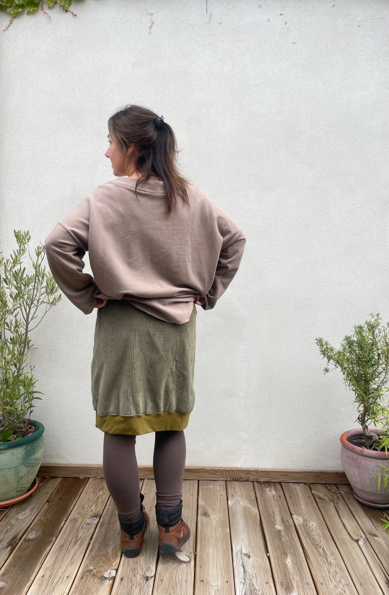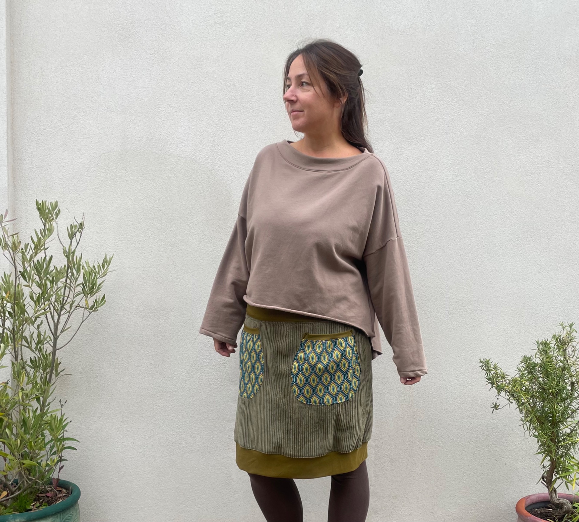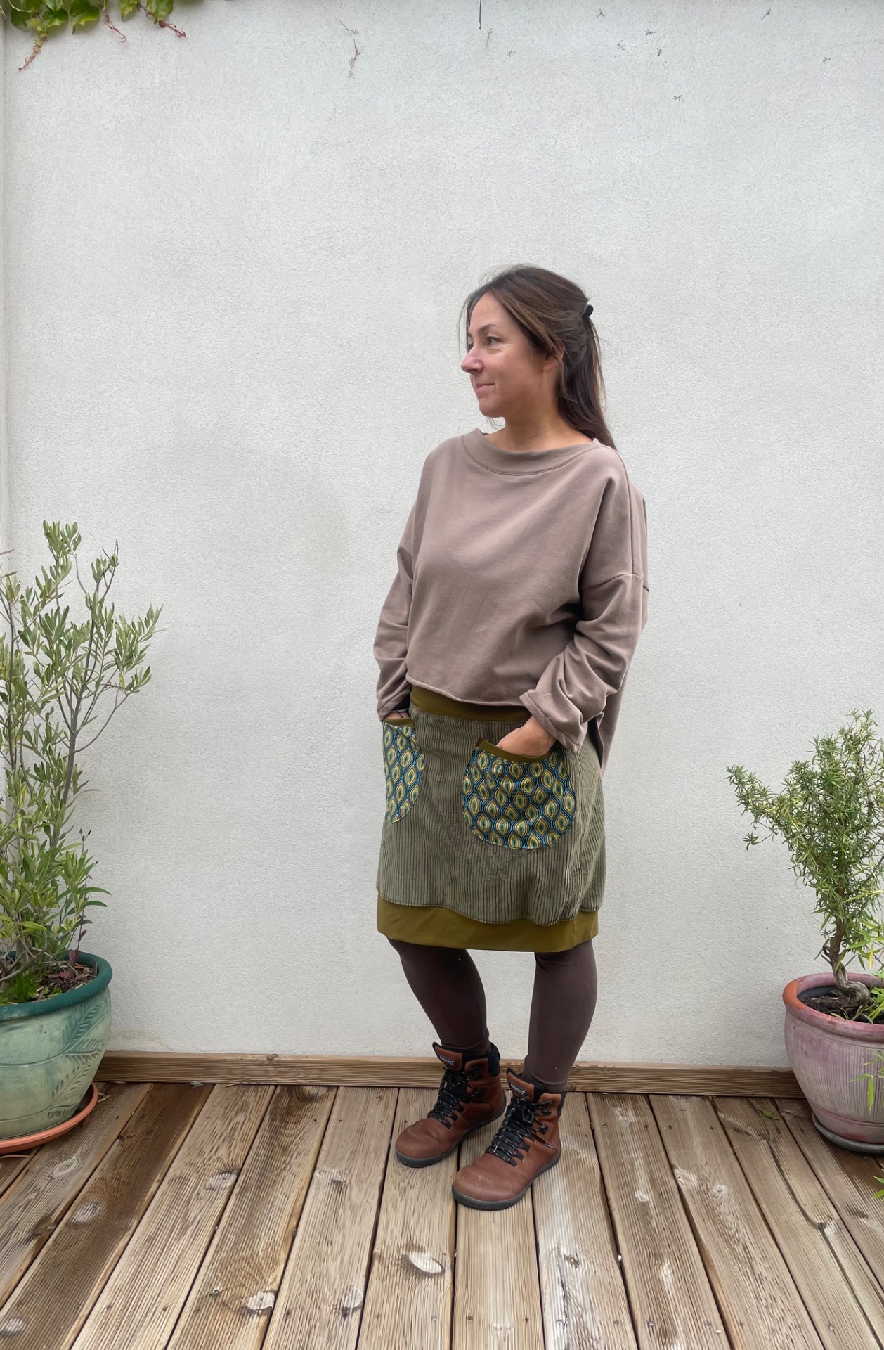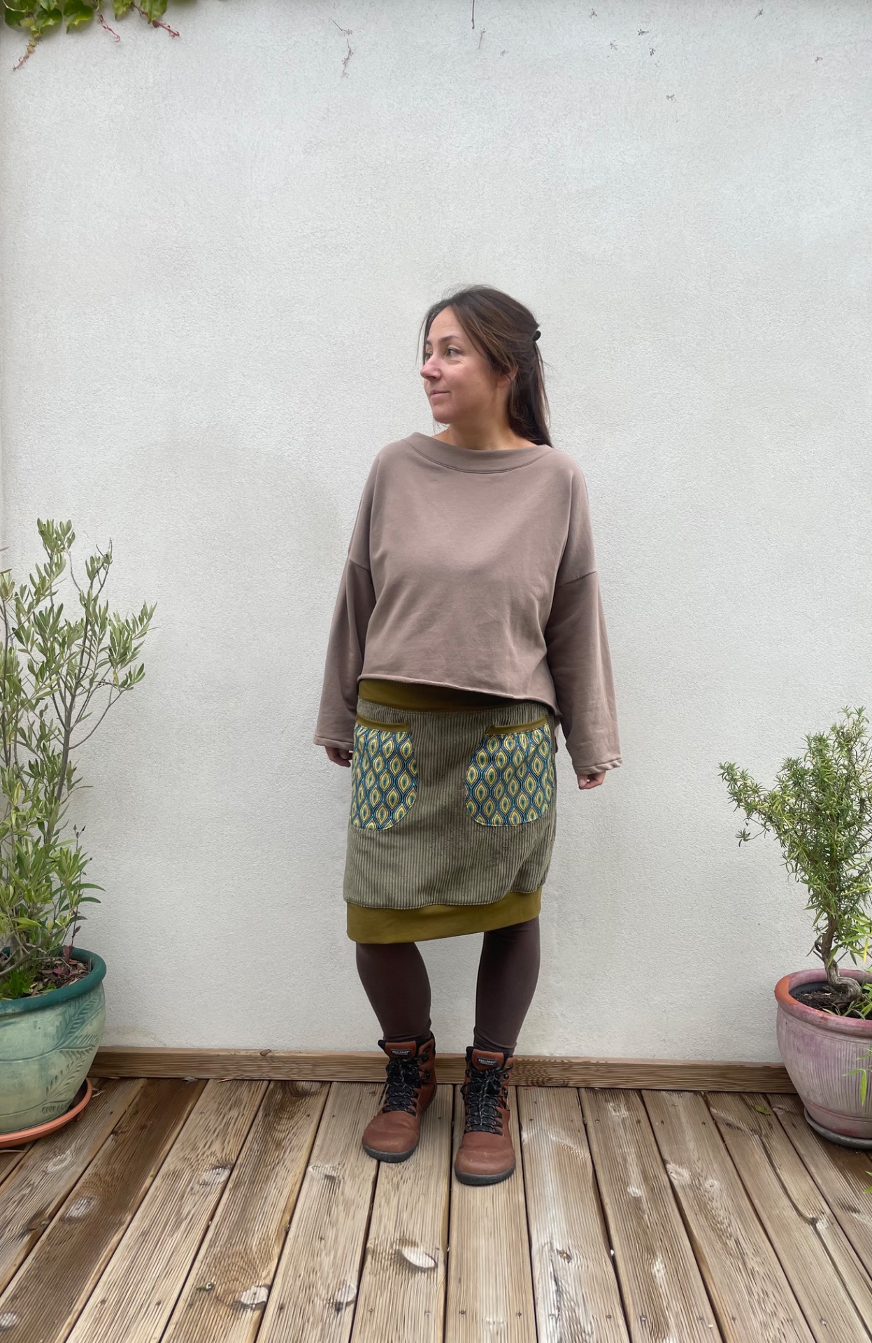 je tvořena z několika dílů, různé druhy materiálu…manšestr, design plátno, bio úplet …v pase pružný úplet, v boku uvnitř záměrně vynechané, pro případné stažení pruženky… velikostně variabilní, s kapsami