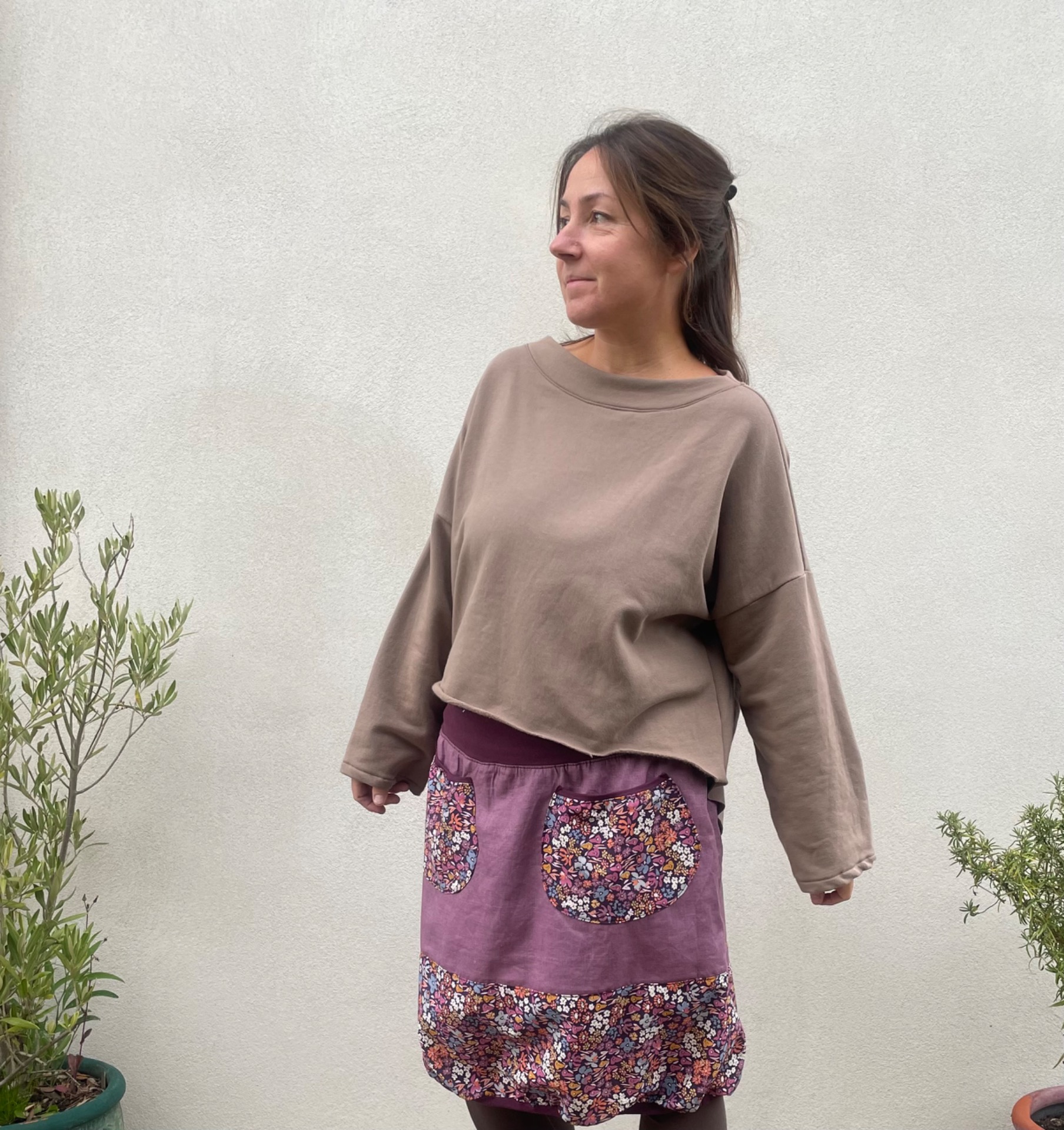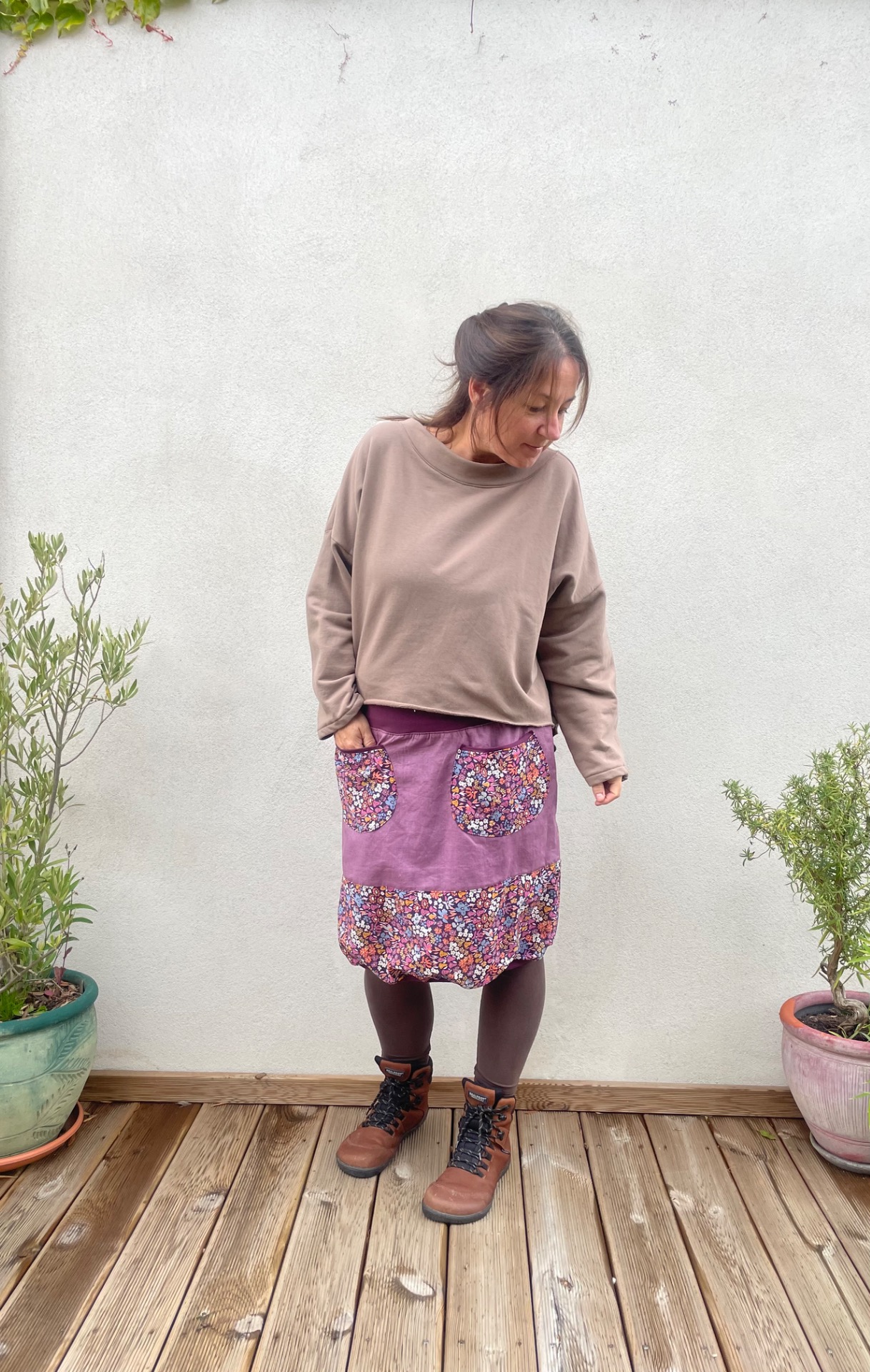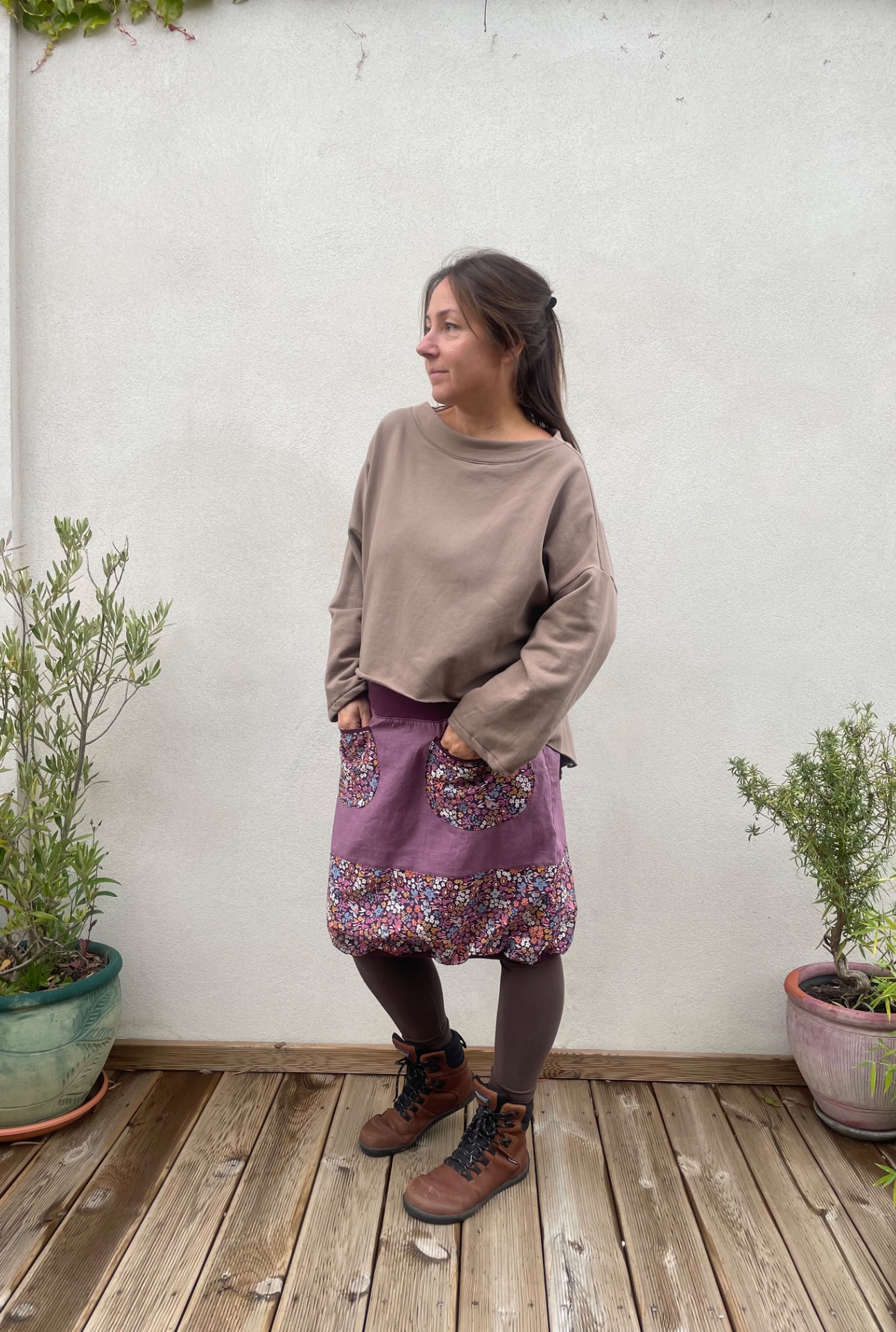 je tvořena z několika dílů, různé druhy materiálu…100%len, bio úplet, design plátno …v pase pružný úplet, v boku uvnitř záměrně vynechané, pro případné stažení pruženky… velikostně variabilní, s kapsami