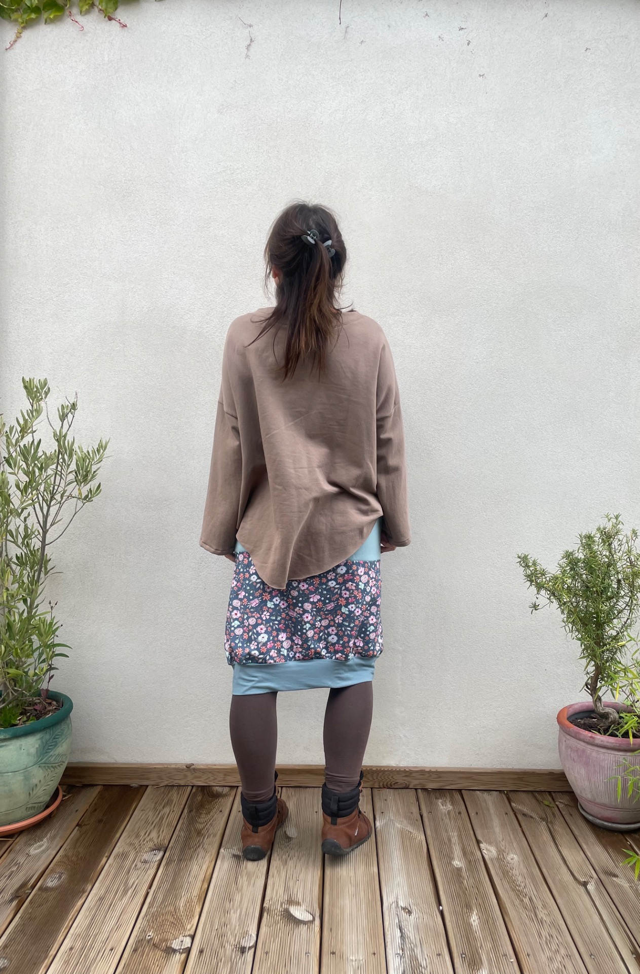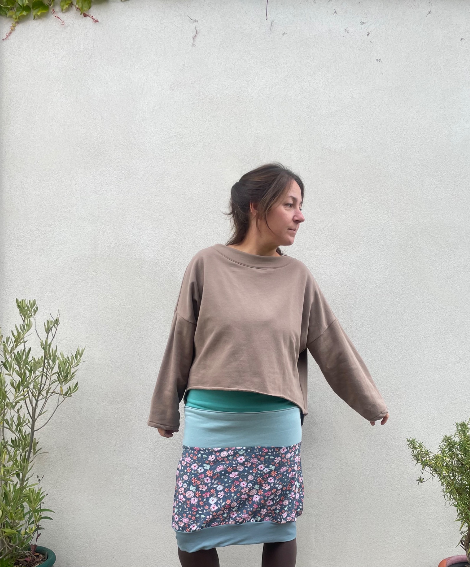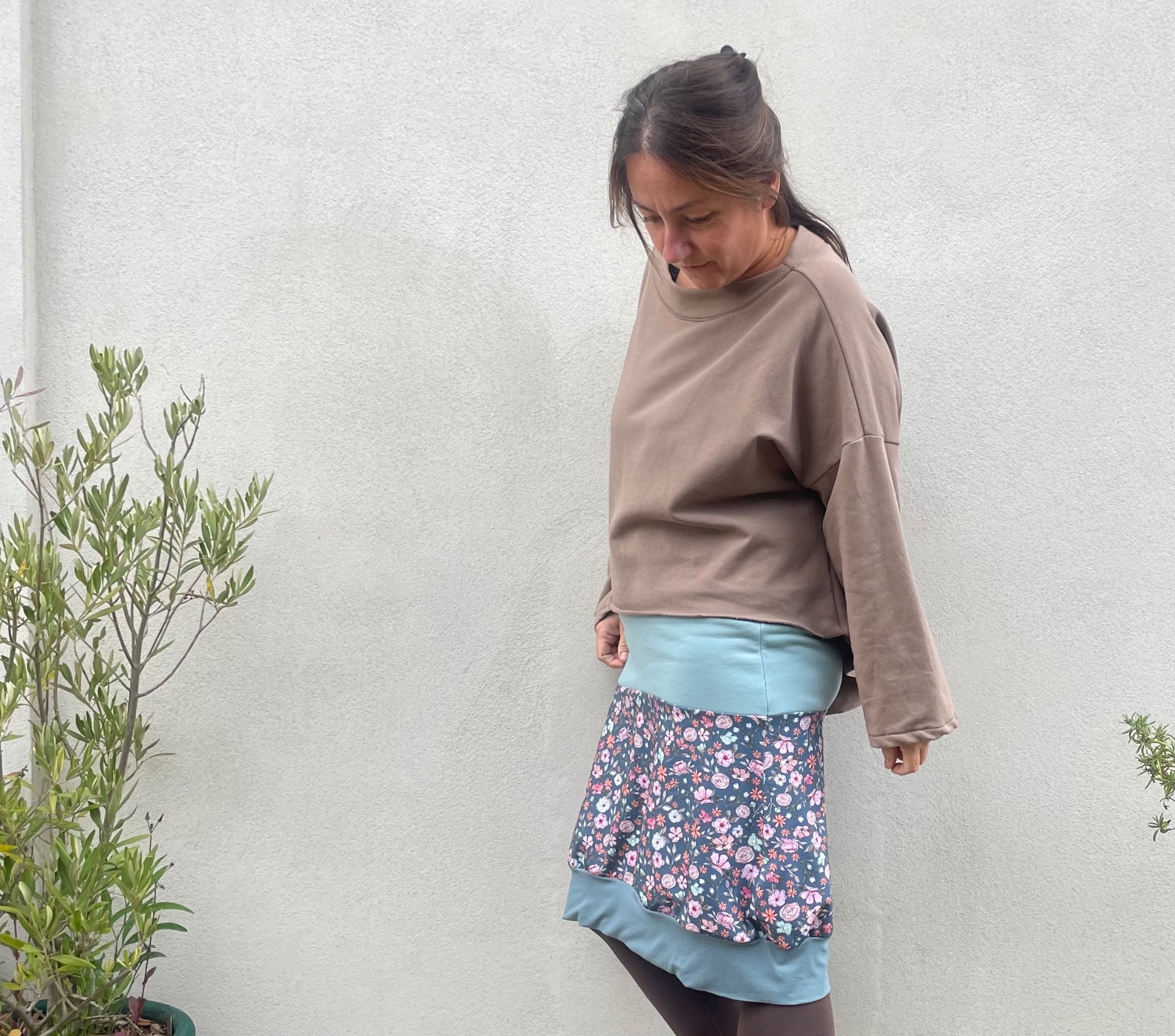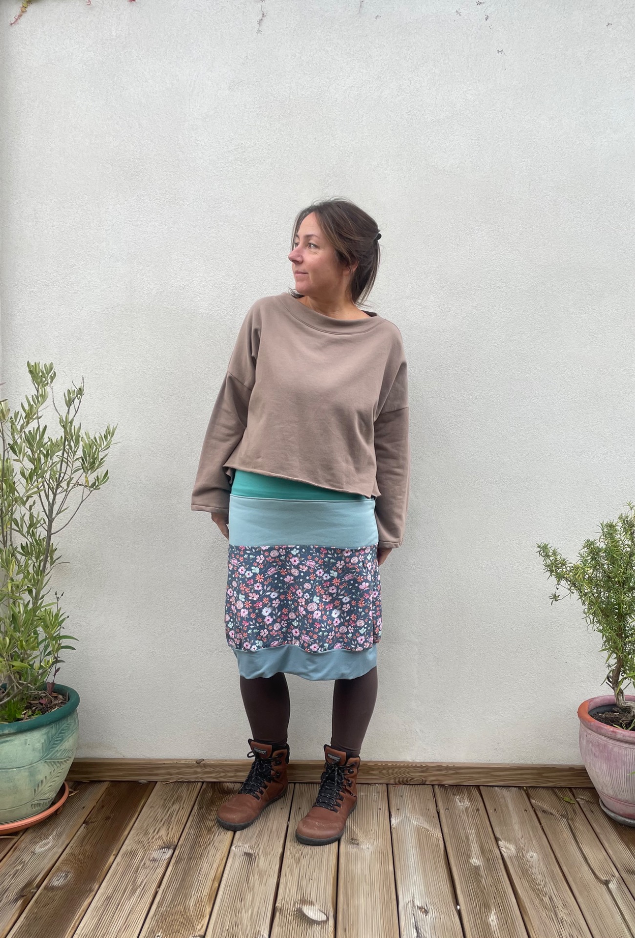je tvořena z několika dílů, různé druhy materiálu…pružná teplá teplákovina, úplet, bio úplet …v pase pružný úplet, v boku uvnitř záměrně vynechané, pro případné stažení pruženky… velikostně variabilní, sukně celá pružná