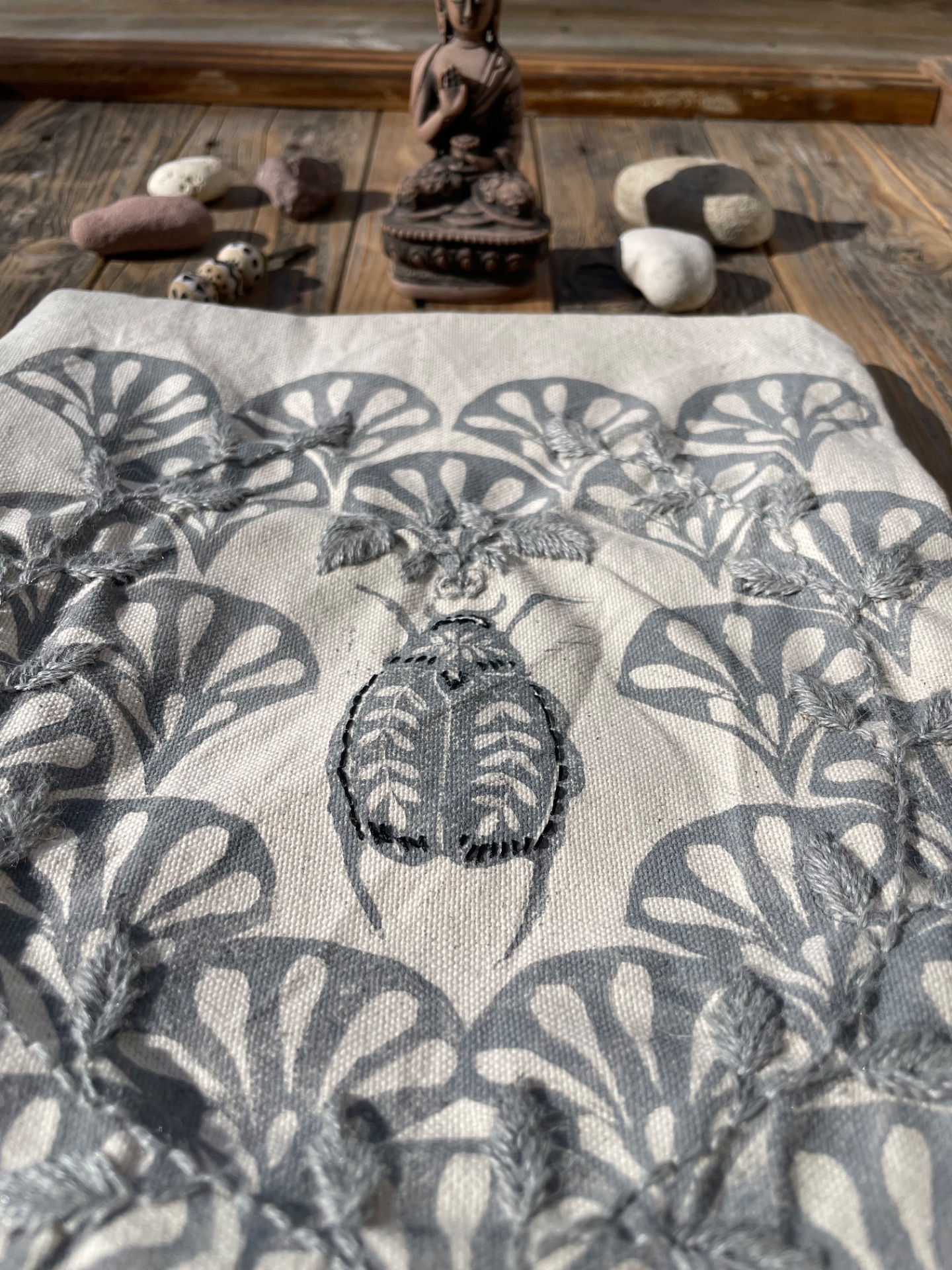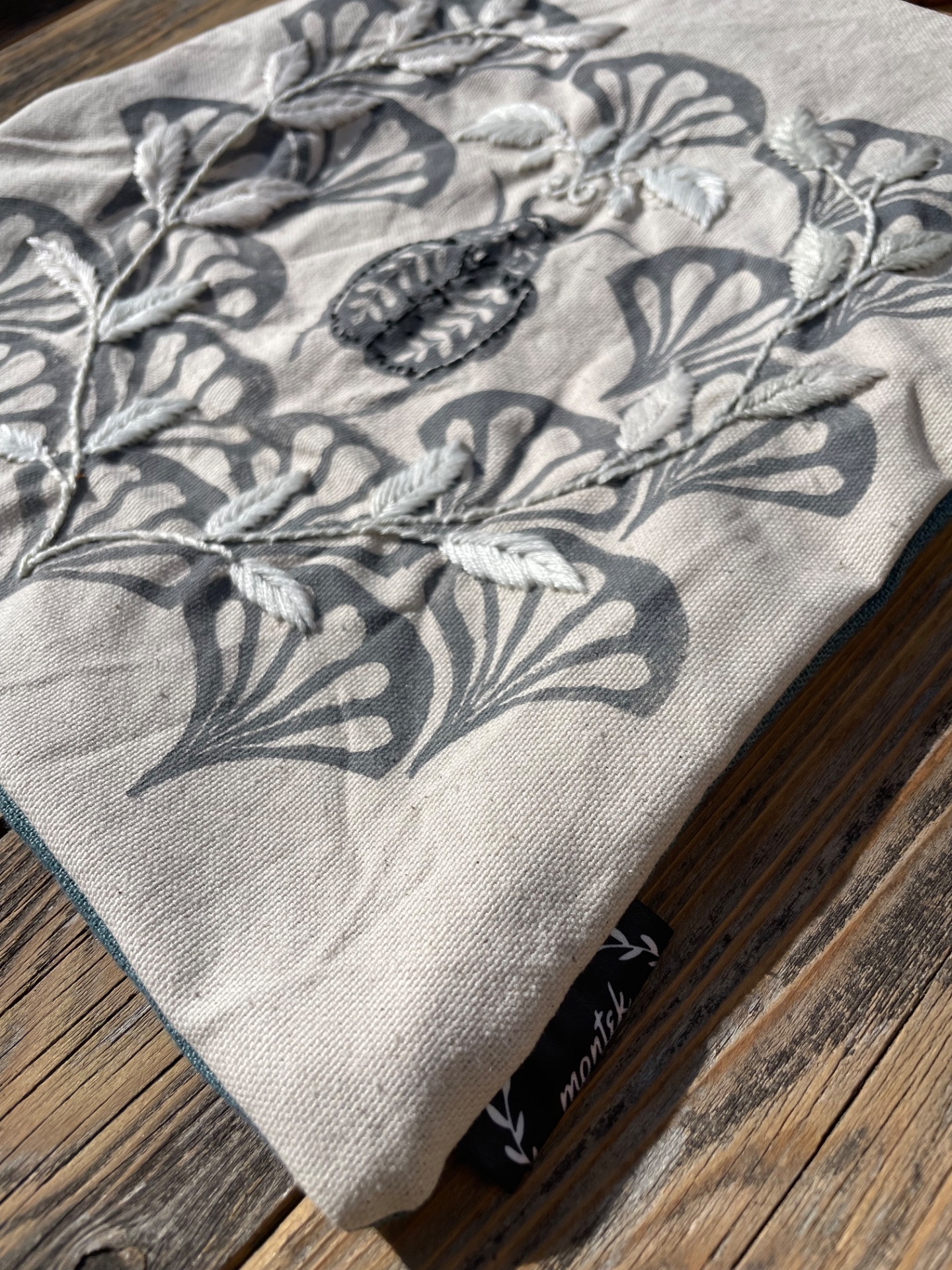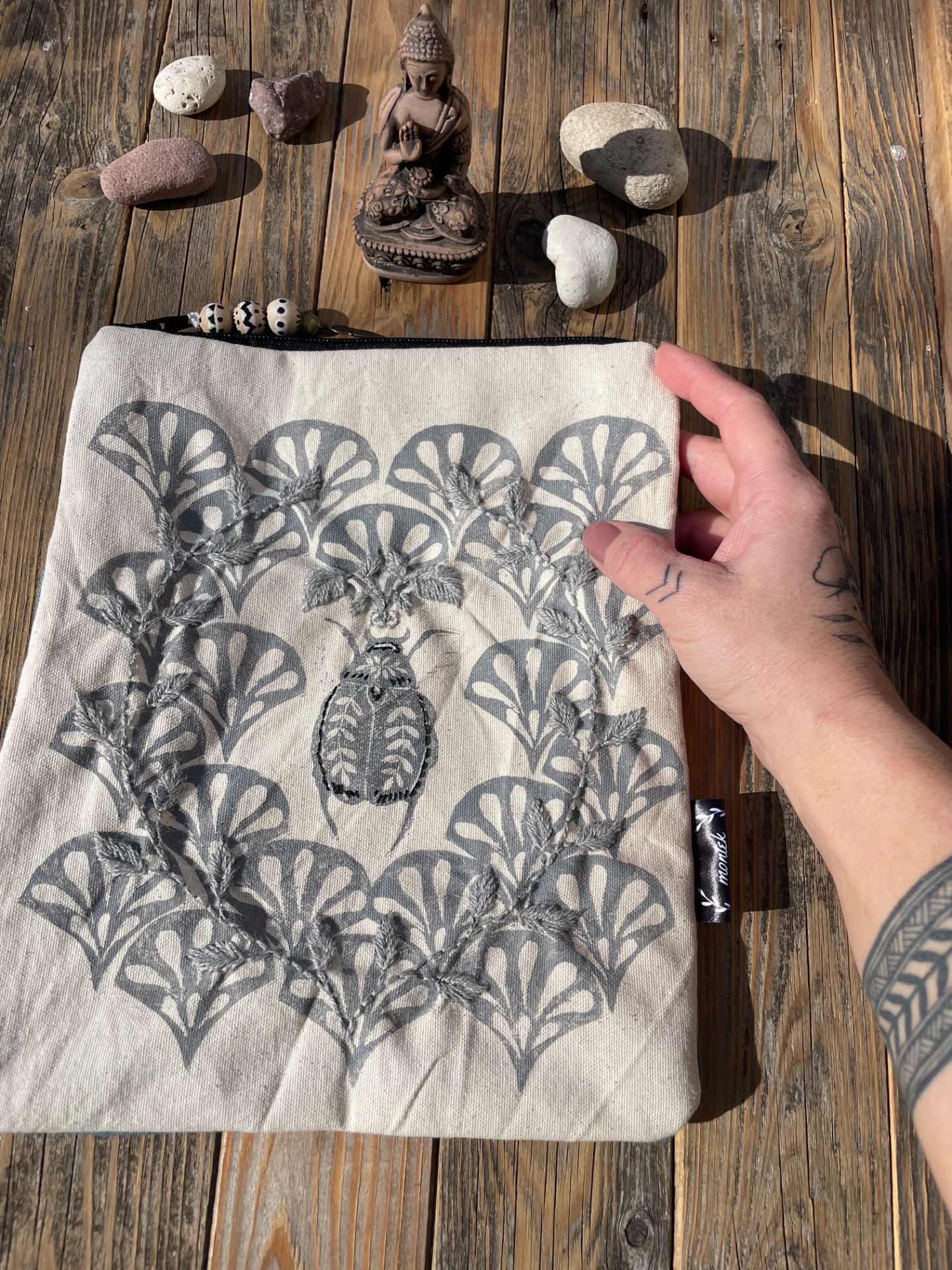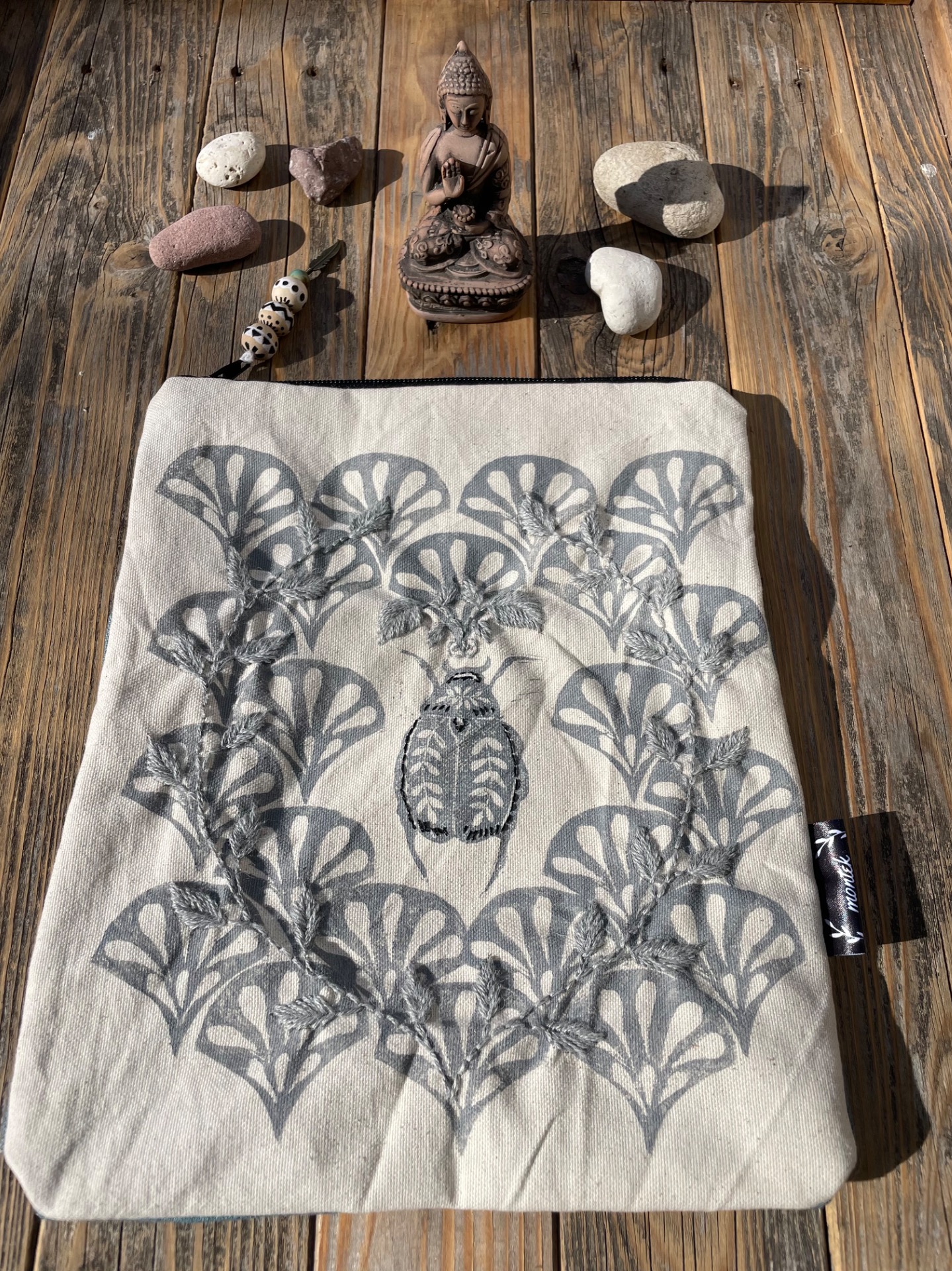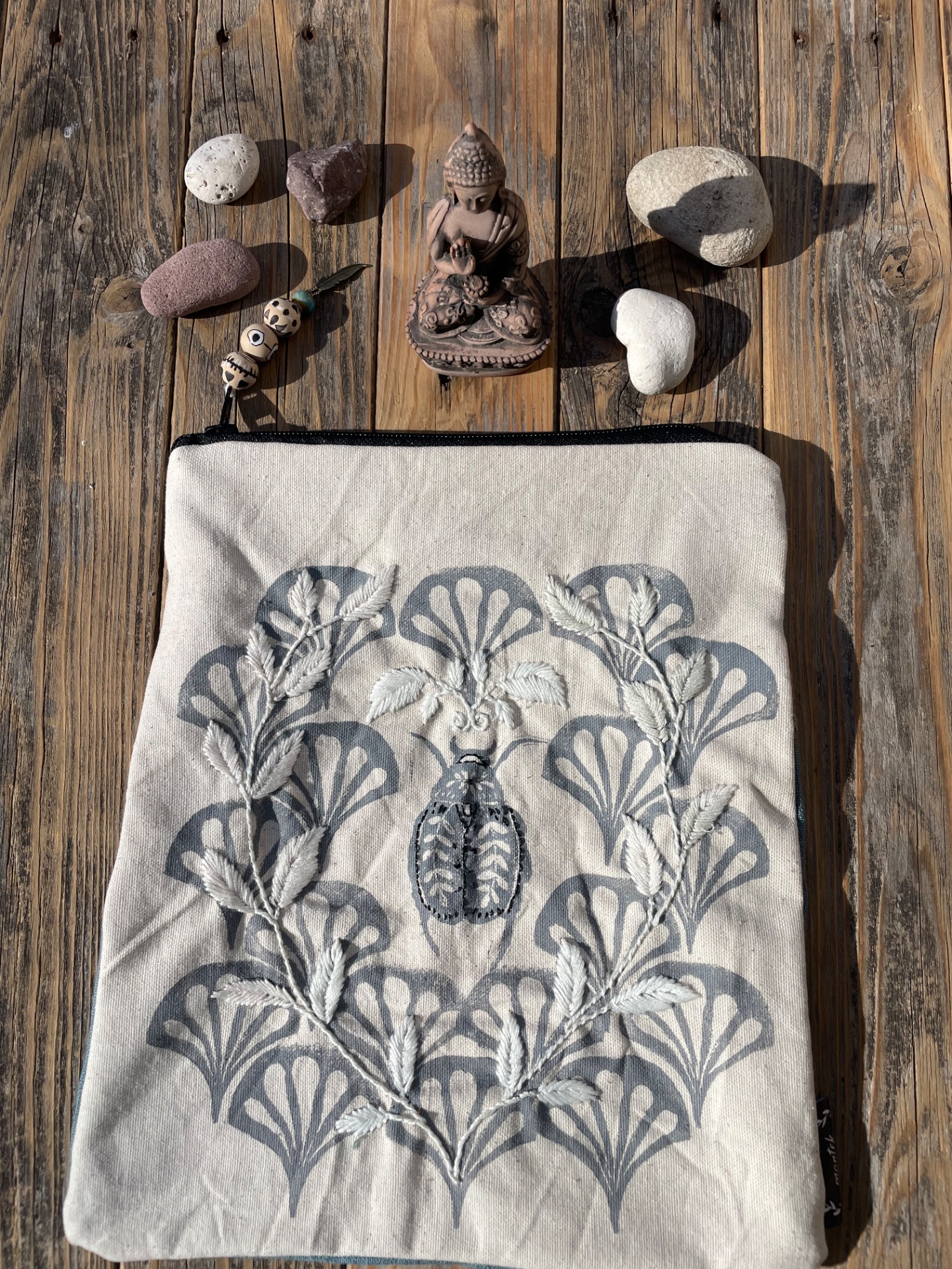 Velká lněná kapsa s ručním tiskem mnou vyřezávaných linorytů a s ruční výšivkou.Praktické zapínání na zip, uvnitř podšívka, ručně malované dřevěné korále.
