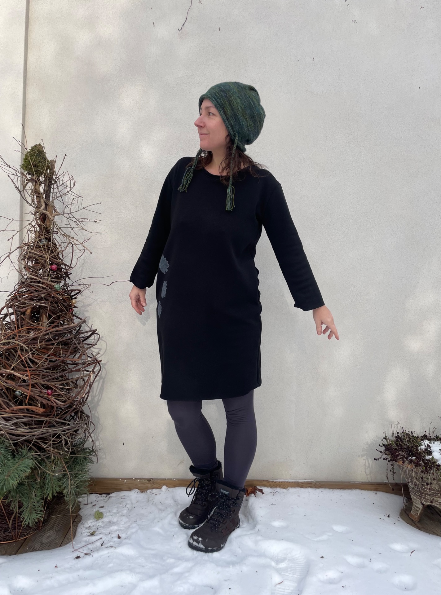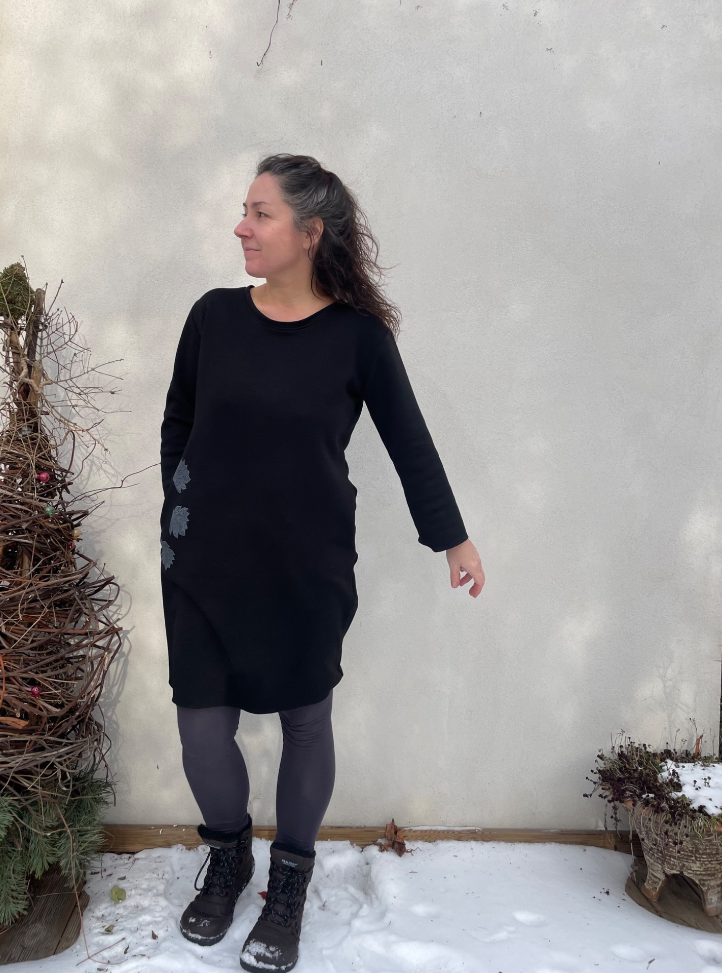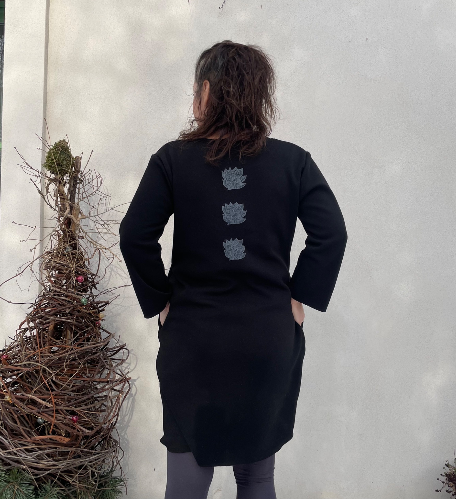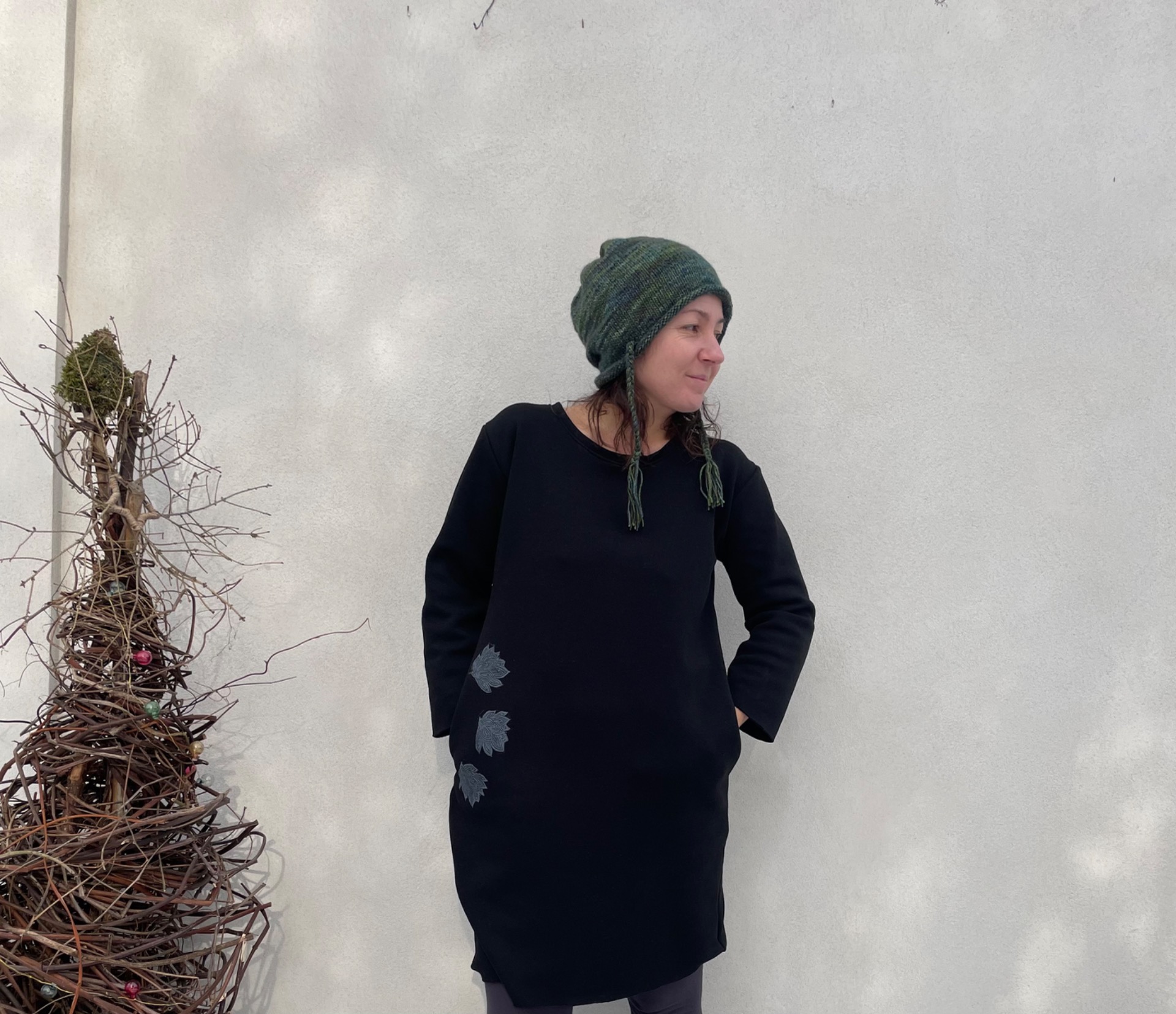 Pružné teplé šaty s 3/4 rukávem, v bocích teplé kapsy. Tisk ručně vyřezávaným linorytem, zafixováno, praní po rubu.